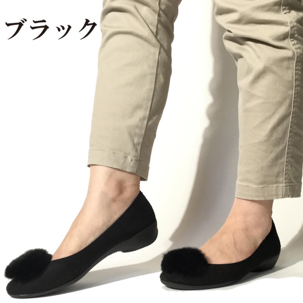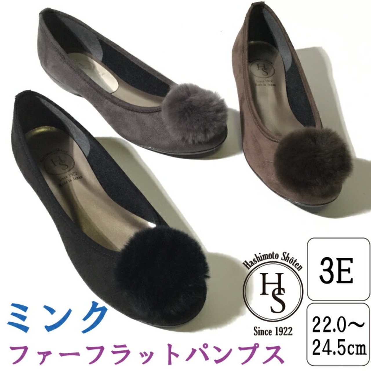 【日本製】 HS ミンク ファー フラット パンプス 3cm ヒール3センチ 3E 外反母趾 ベージュ ブラック
