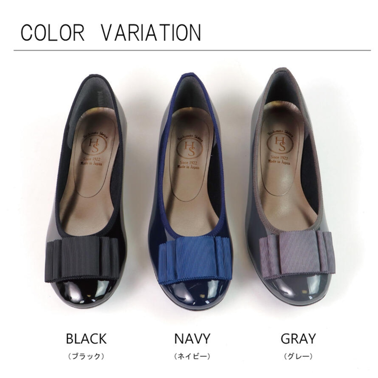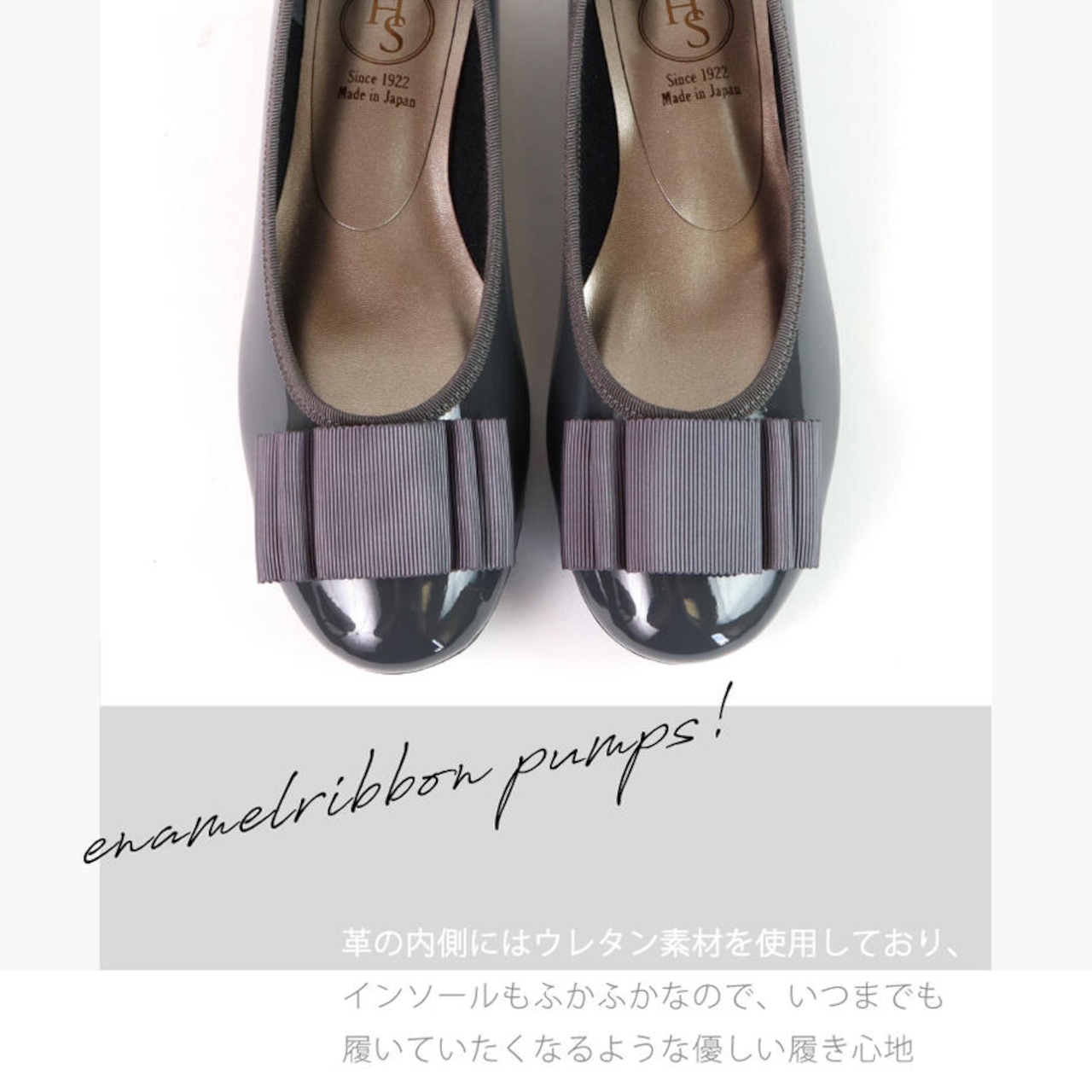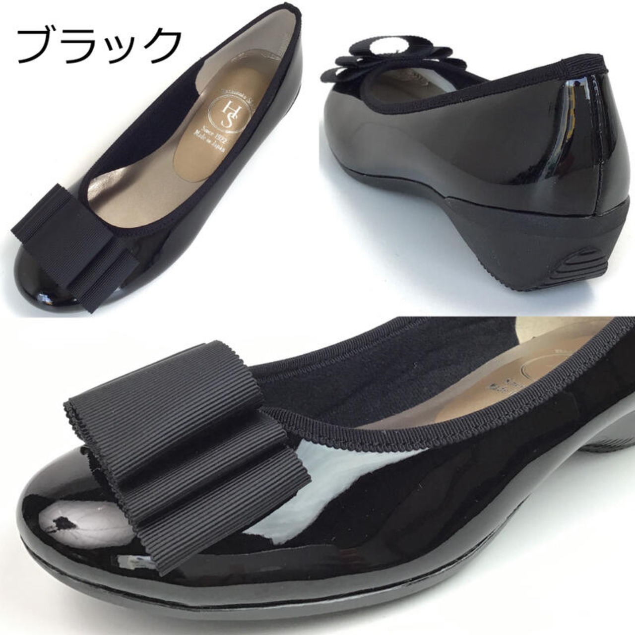 【日本製】 HS 大好評木型で作った エナメル フラットシューズ 歩きやすい レディース リボン ヒール3センチ 3E ブラック 黒