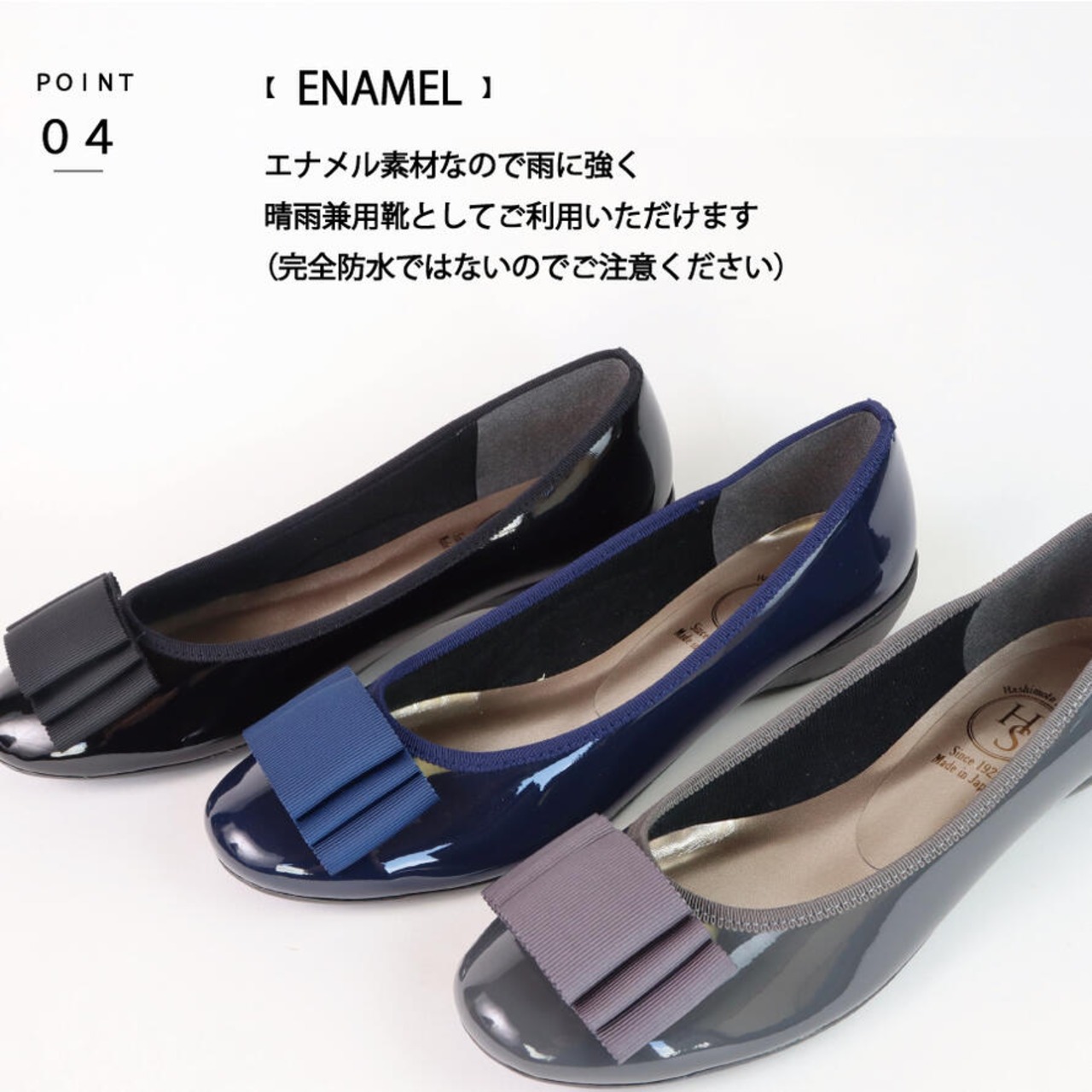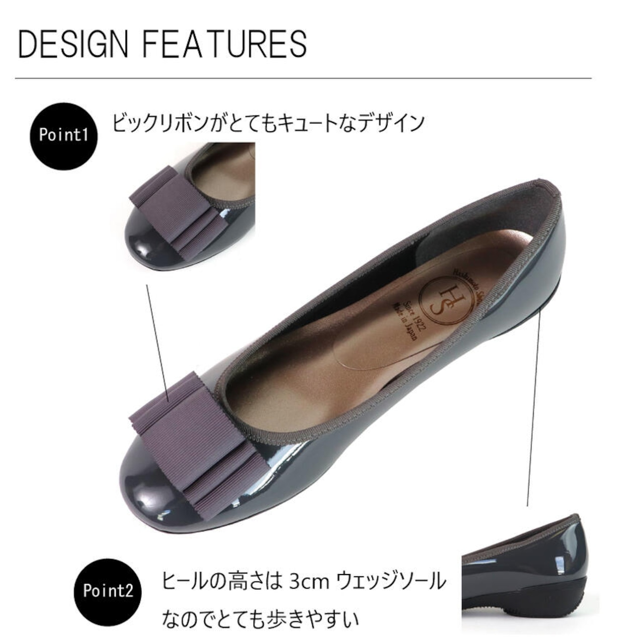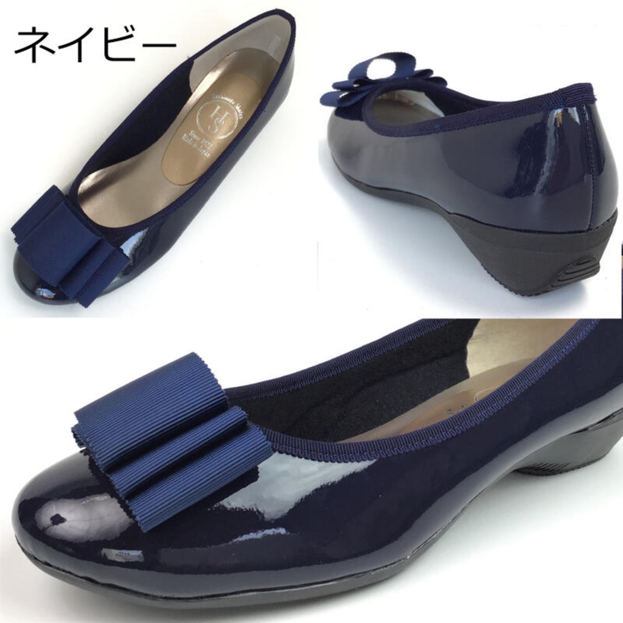 【日本製】 HS 大好評木型で作った エナメル フラットシューズ 歩きやすい レディース リボン ヒール3センチ 3E ブラック 黒
