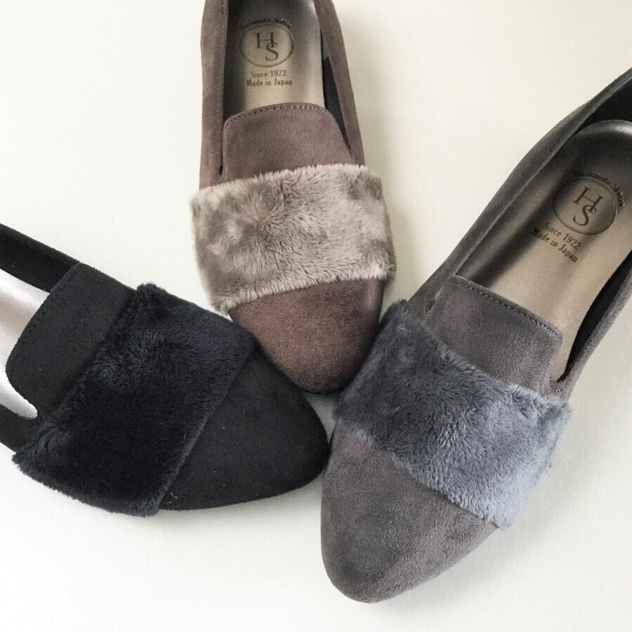 【日本製】 HS フロント ファー スエード ローファー レディース 3E 2cm ヒール ブラック 外反母趾