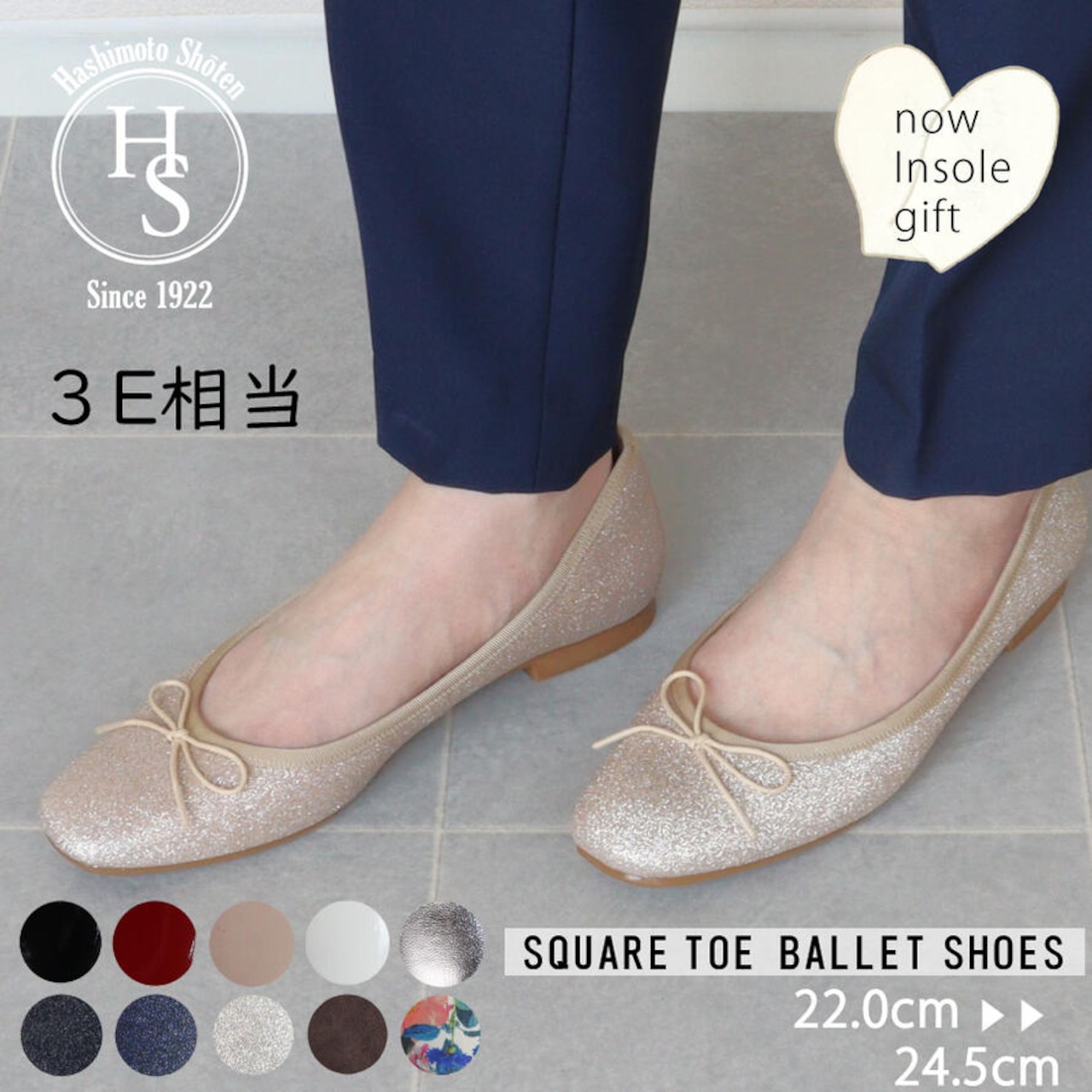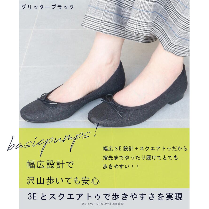 【日本製】 HS スクエアトゥ バレエシューズ レディース エナメル スエード ブラック ベージュ パンプス グリッター 3E 相当