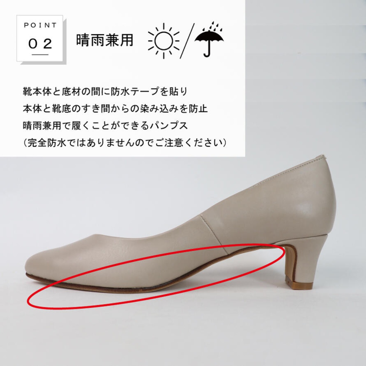 ・靴本体と底材の間に防水テープを貼りすき間からの染み込みを防止。晴雨兼用で履くことができます(完全防水ではありませんのでご注意ください)