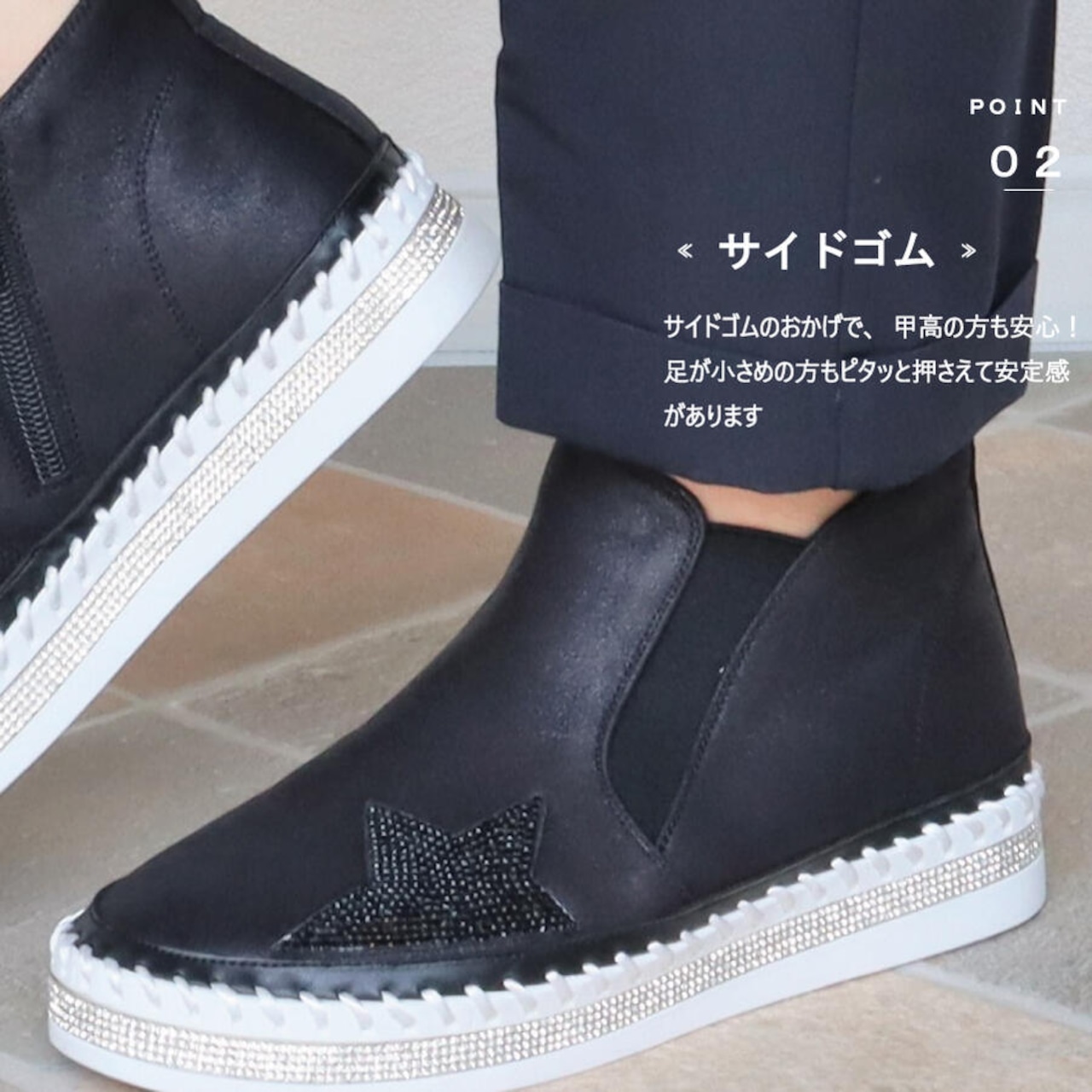 ・サイドゴムのおかげで足の小さい方でもピタッと押さえて安定感があります