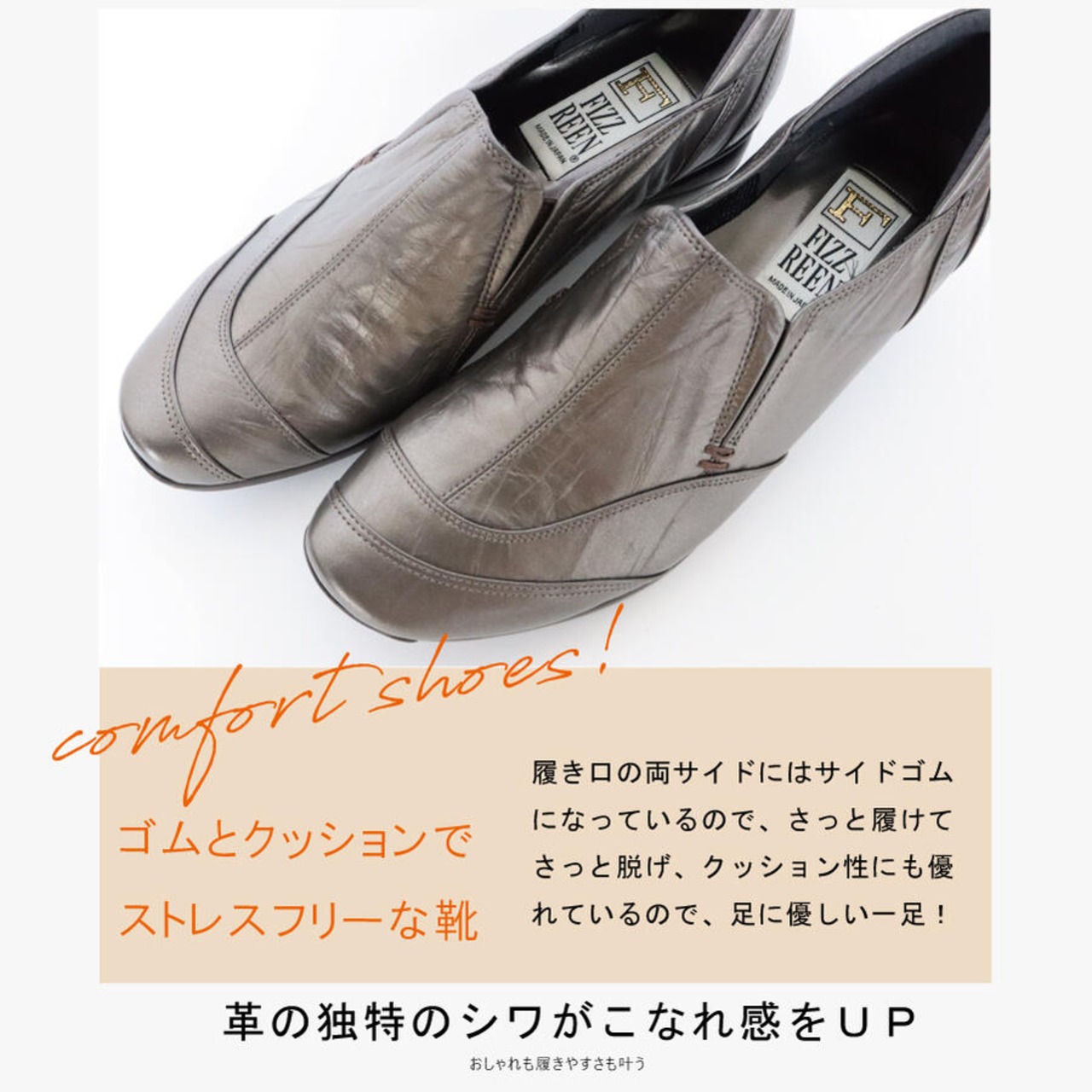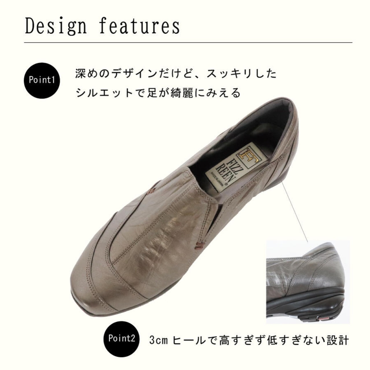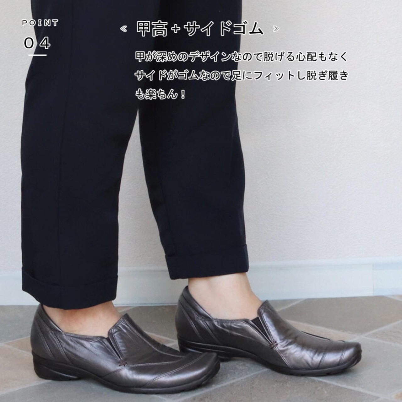・甲が深めのデザイン+サイドゴムのおかげで足にフィットし脱着もらくちん