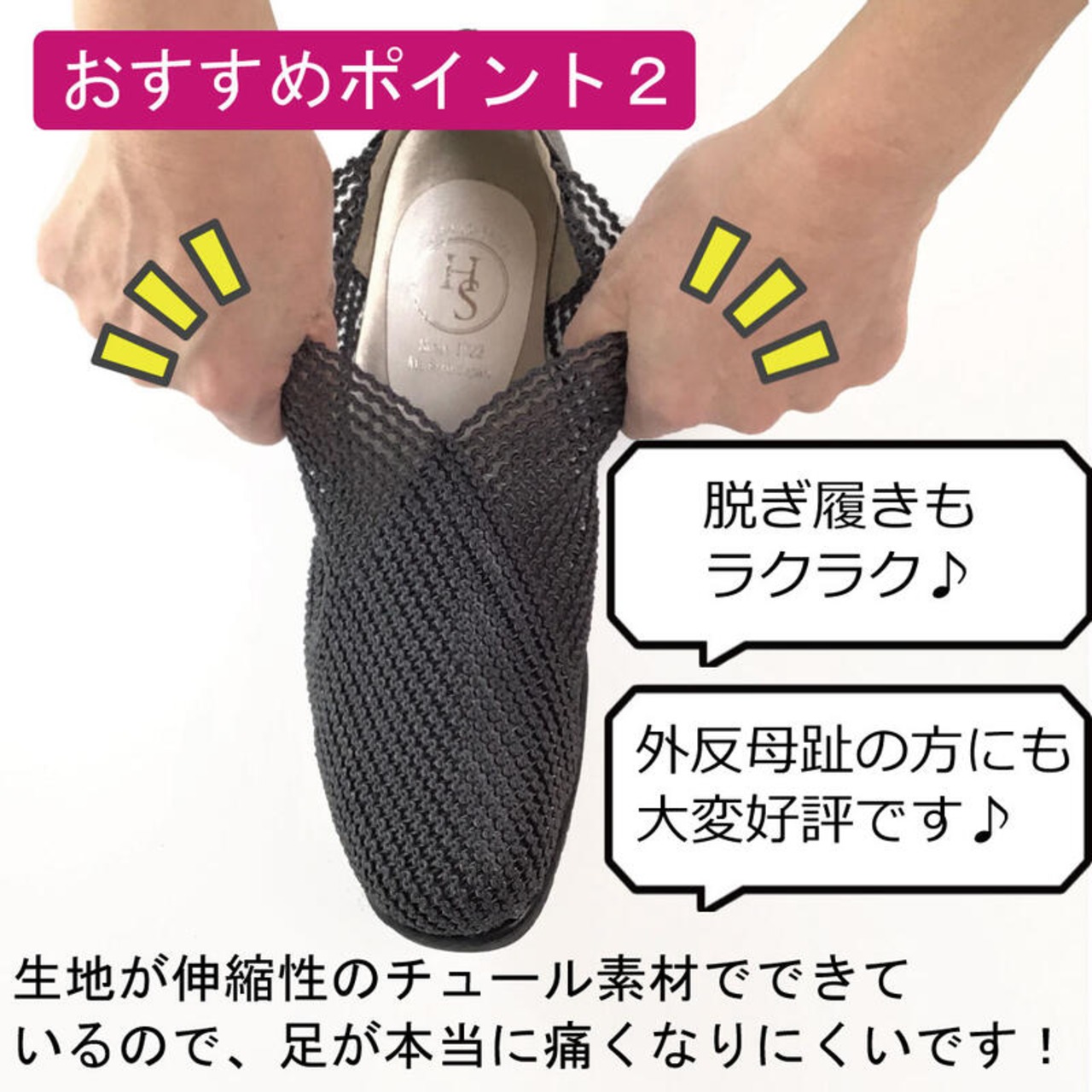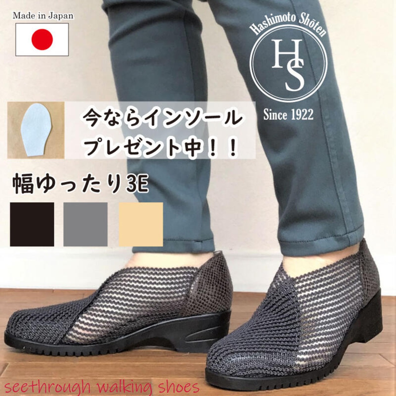 【日本製】 HS シースルー ウォーキングシューズ レディース おしゃれ 疲れない おすすめ 幅広 3E 紐なし ブラック 半額