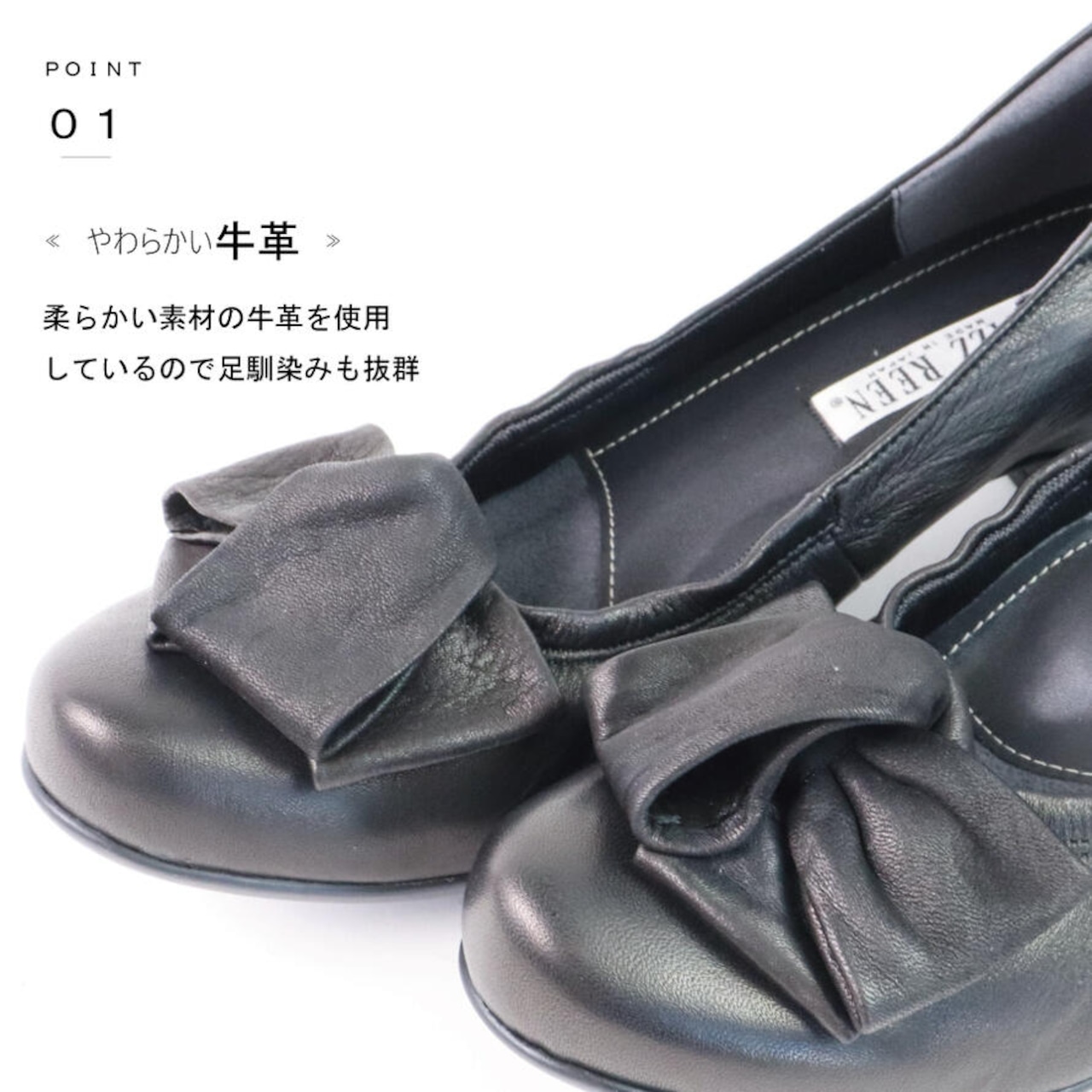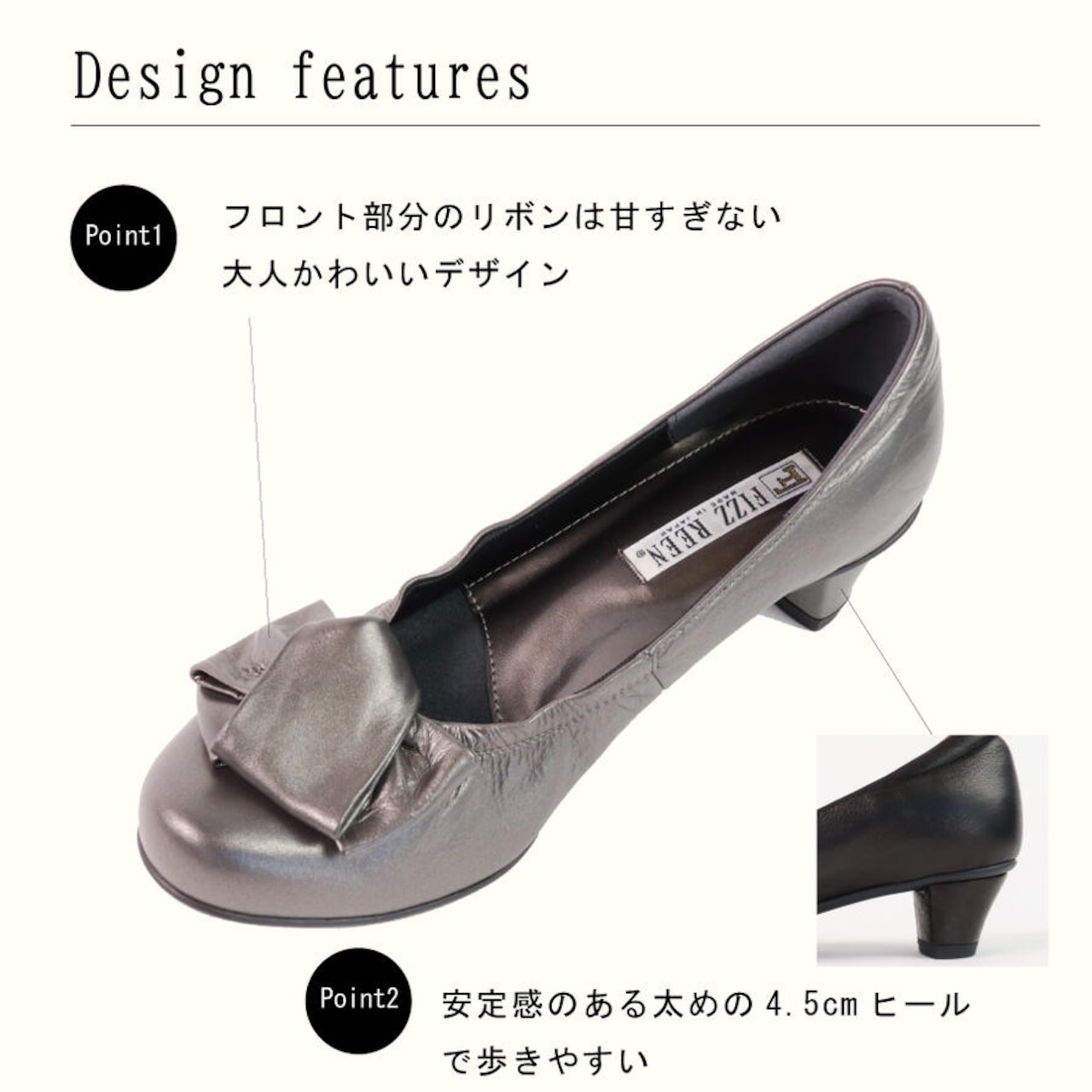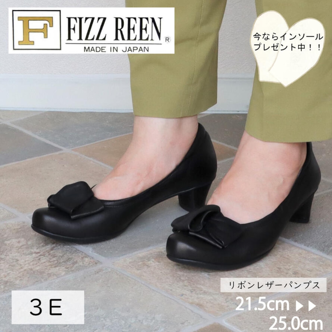 【FIZZ REEN】 リボン レザー パンプス 本革 ローヒール フォーマル 21.5 25.0 痛くない 厚底 おしゃれ 靴 黒 ヒール 4センチ