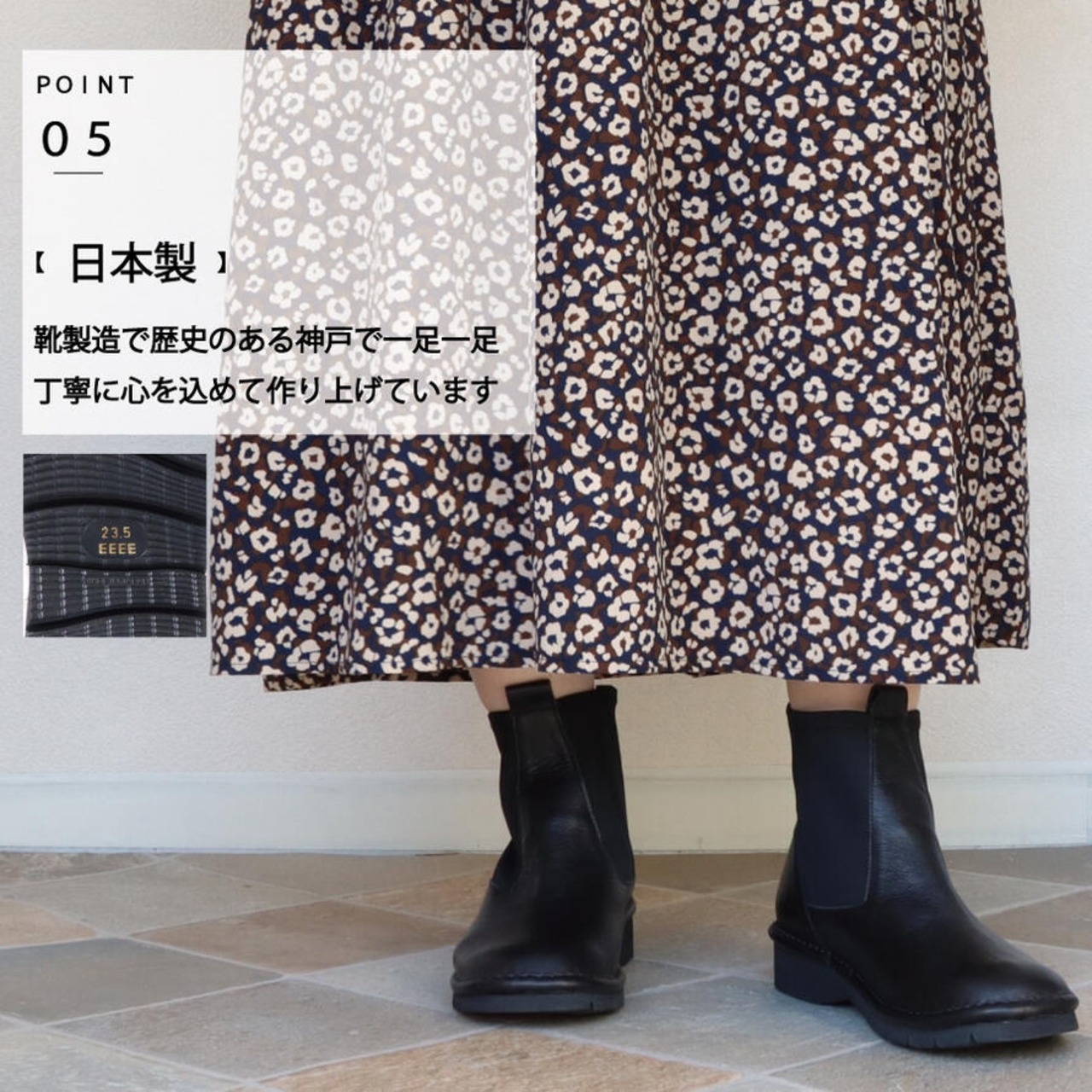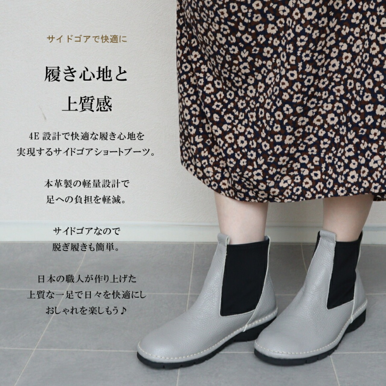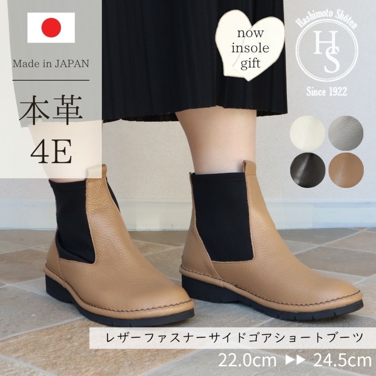 【日本製】 HS ファスナー 付き サイドゴア ブーツ レディース 本革 ブラック 3cm ヒール3センチ 4E 軽量 ショートブーツ 黒