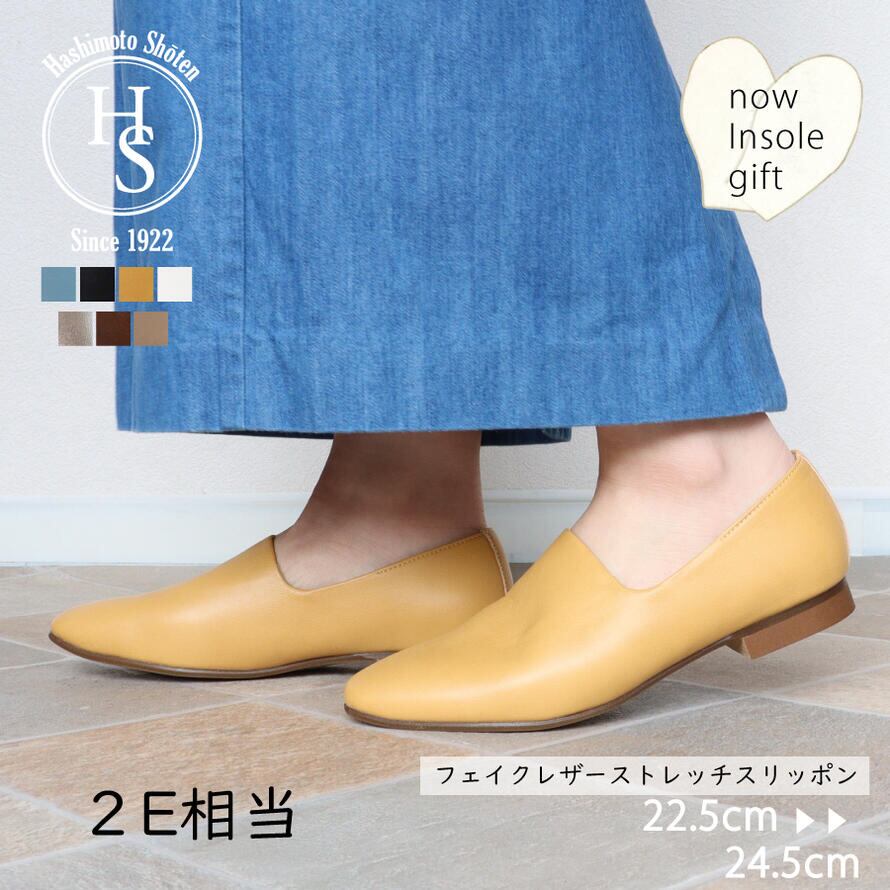 【日本製】 HS フェイクレザー ストレッチ スリッポン レディース 幅広 歩きやすい ローヒール 2E 相当 軽量 スニーカー 半額