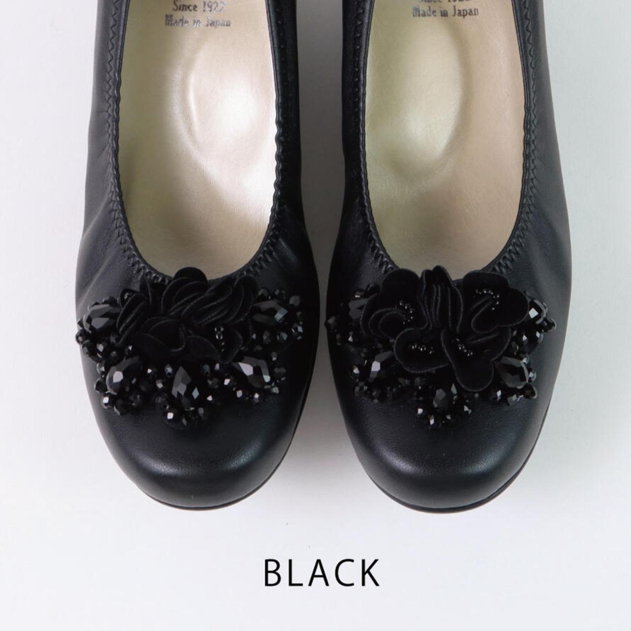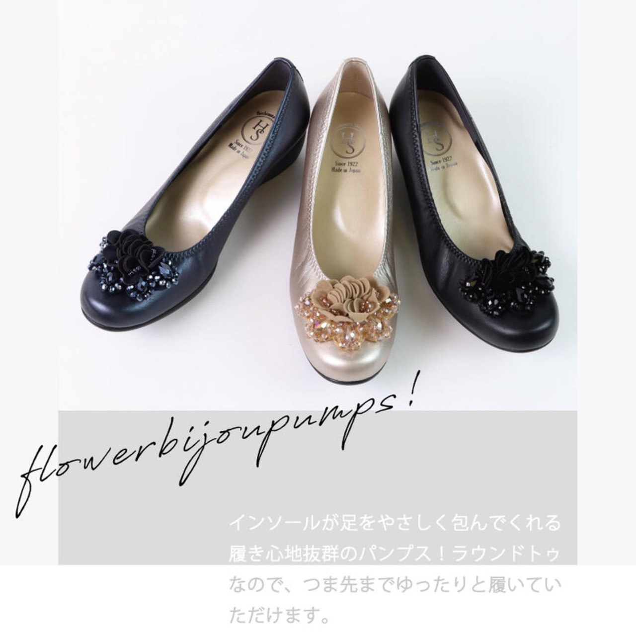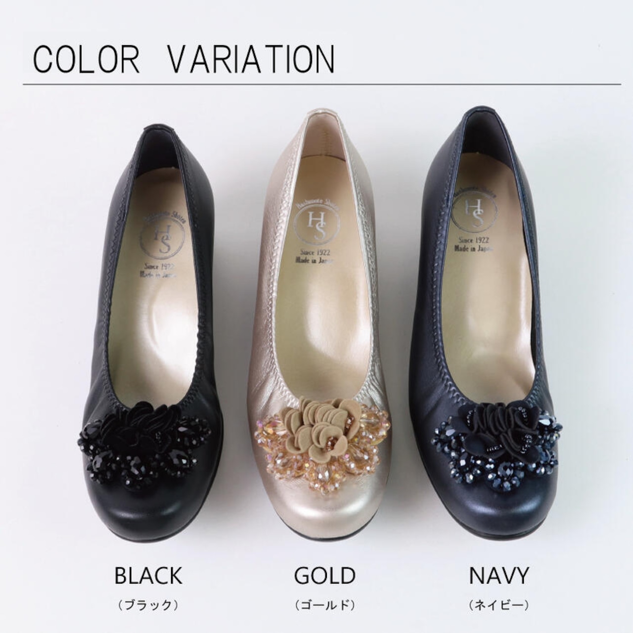 【日本製】 HS キラキラ ビジュー フラワー パンプス 4cm ヒール4センチ スムース 3E 相当 ブラック シルバー ベージュ