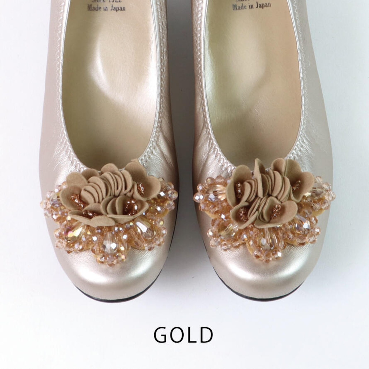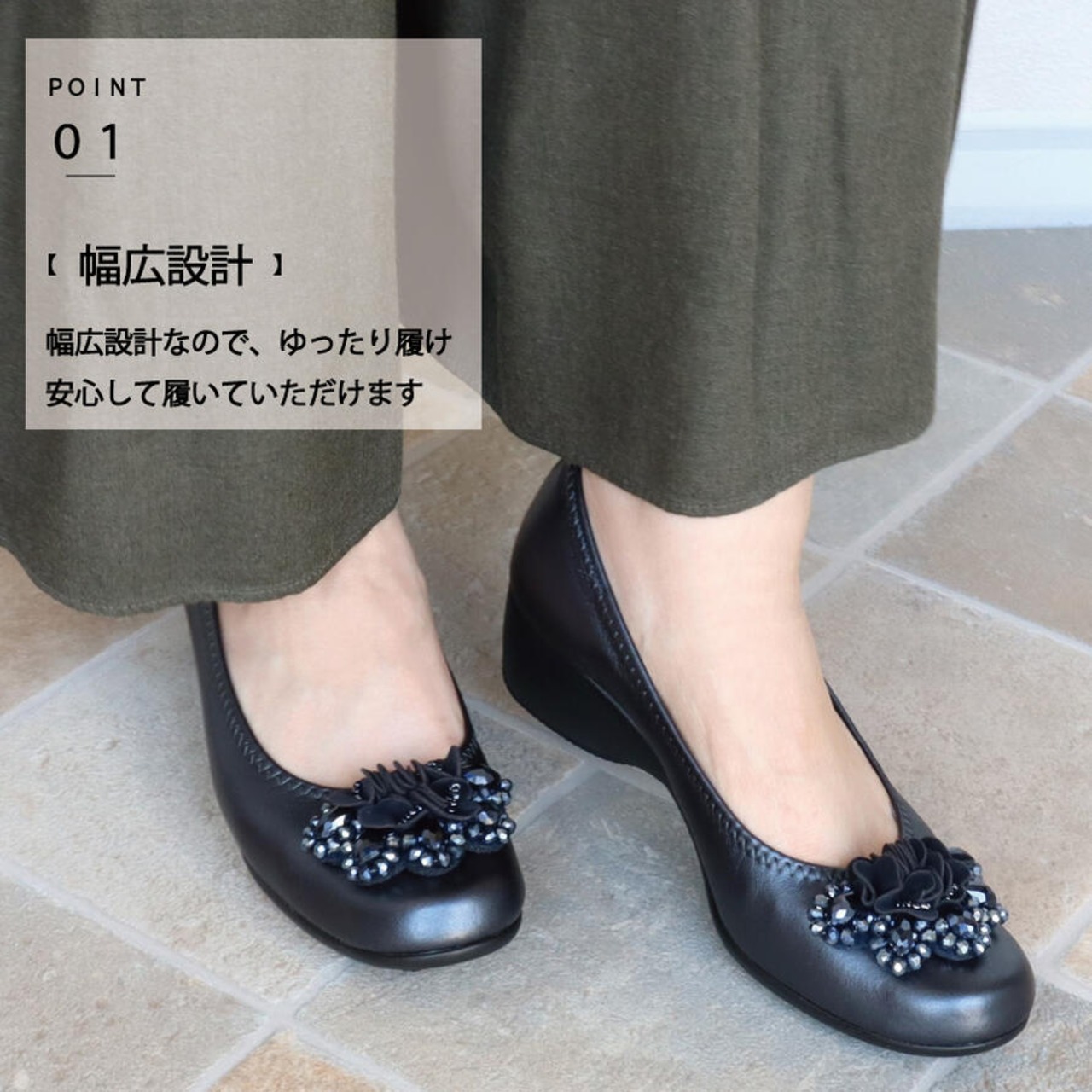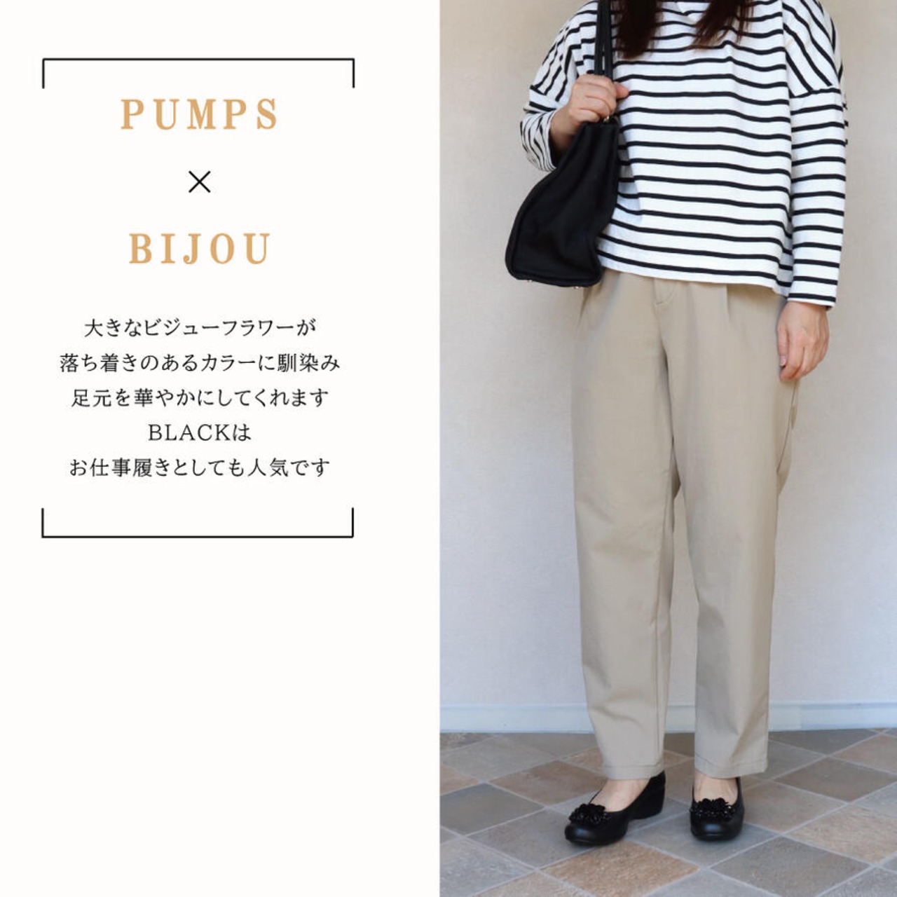 【日本製】 HS キラキラ ビジュー フラワー パンプス 4cm ヒール4センチ スムース 3E 相当 ブラック シルバー ベージュ
