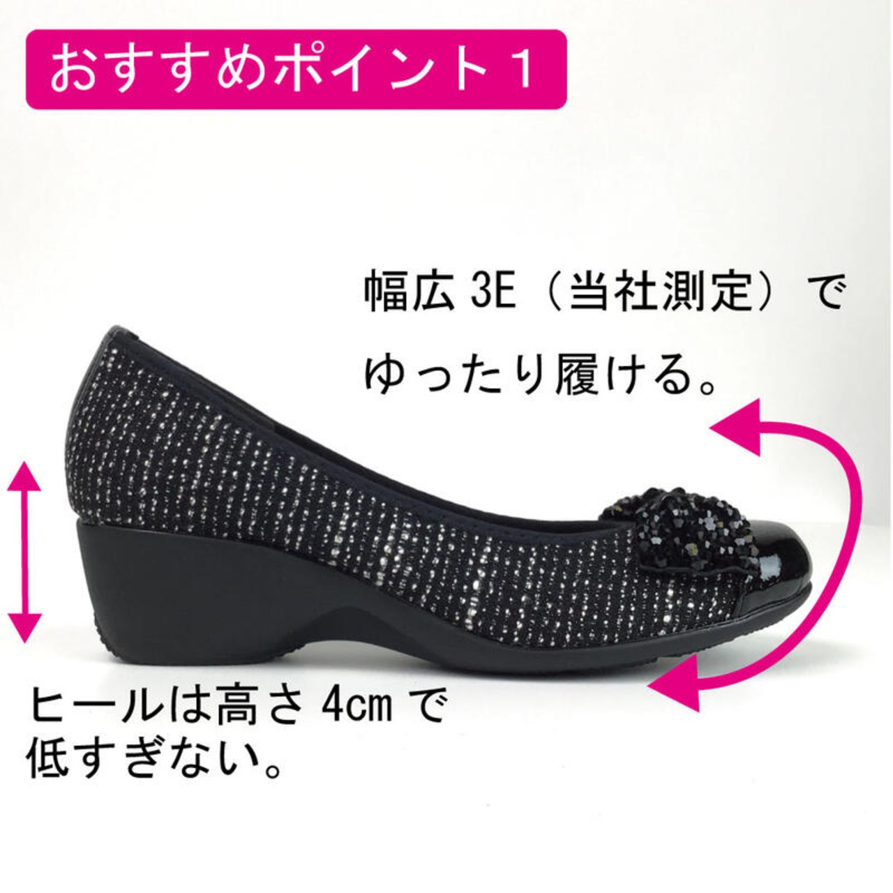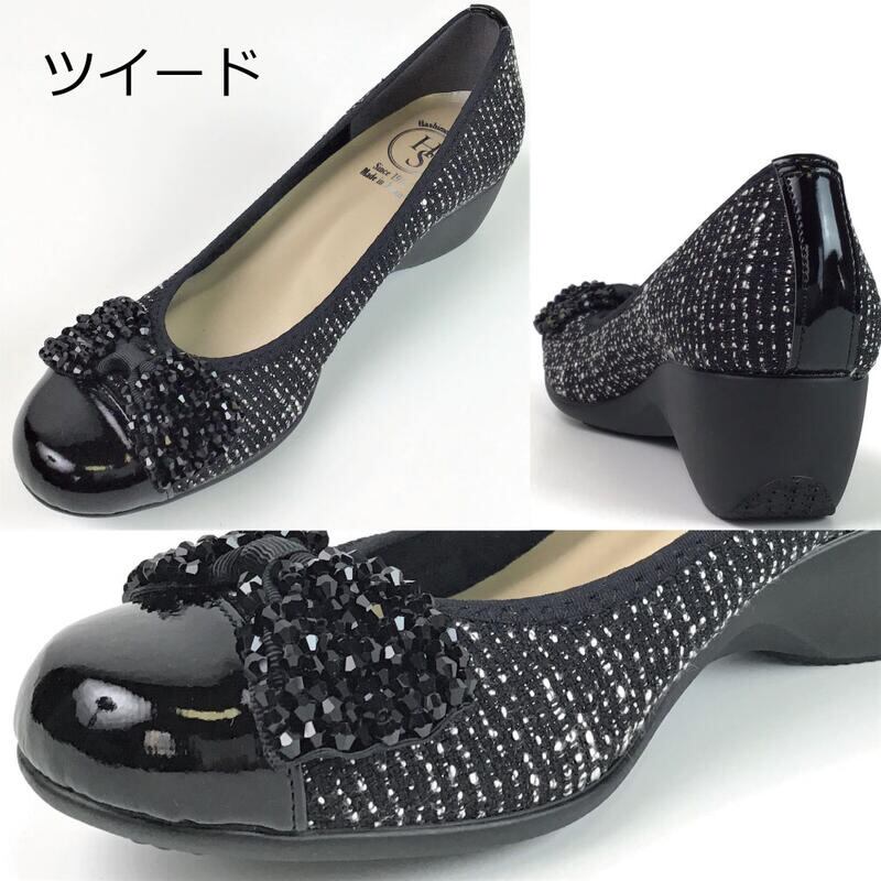 【日本製】 HS キラキラ ビジュー リボン パンプス 4cm ヒール4センチ 3E EEE 相当 レオパード ヒョウ柄 ツイード ウェッジソール 幅広 半額