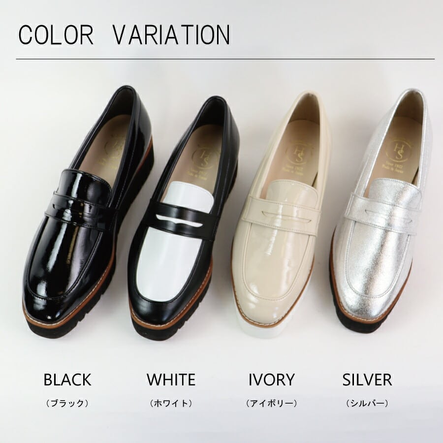【日本製】 HS エナメル 厚底 コイン ローファー レディース 痛くない 歩きやすい エナメル ヒール3センチ 2E 相当 幅広 おしゃれ 雨の日 おじ靴 黒 白 靴 3cm ヒール 軽量