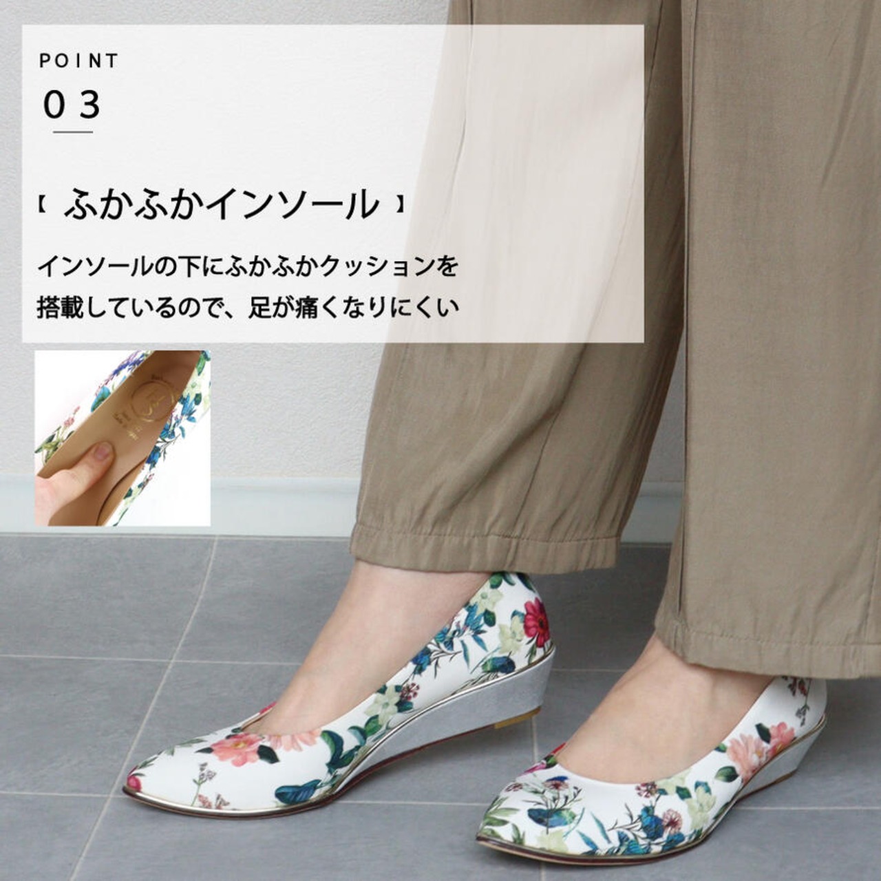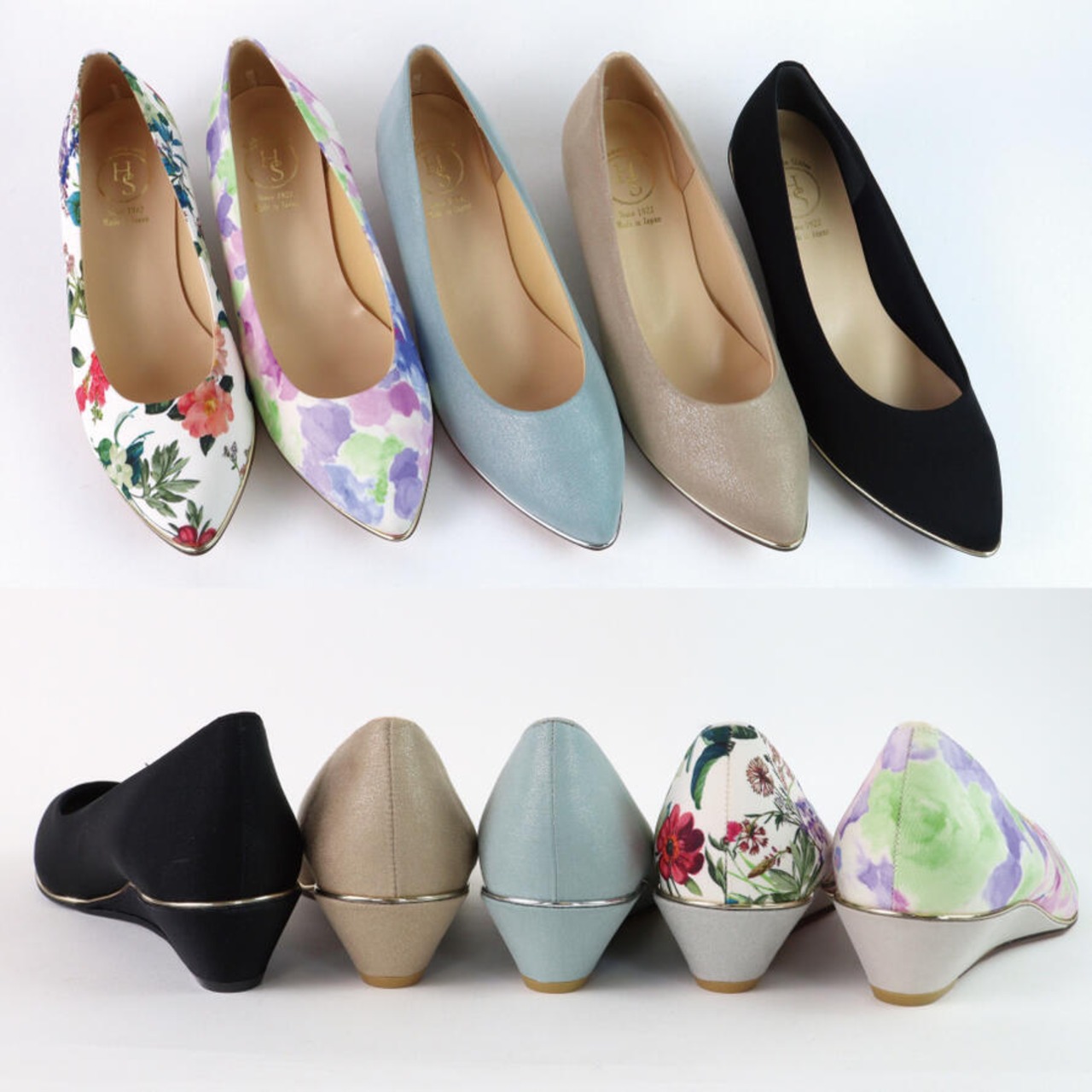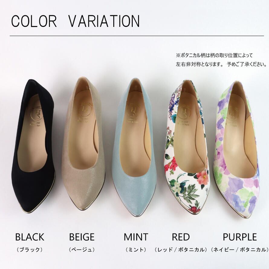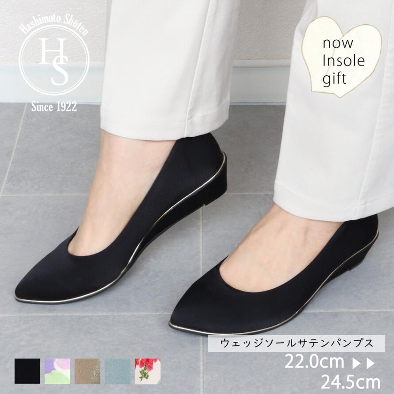 【日本製】 HS ウェッジソール サテン パンプス 3E 相当 外反母趾 3cm ヒール3センチ ブラック ベージュ 花柄 ボタニカル