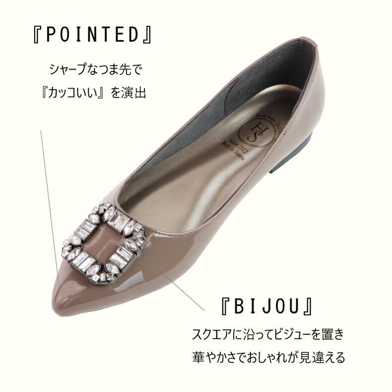【日本製】 HS ポインテッドトゥ ビジュー パンプス スクエア ヒール 3E 幅広 ローヒール 黒 痛くない ぺたんこ フラットシューズ エナメル 晴雨兼用 半額