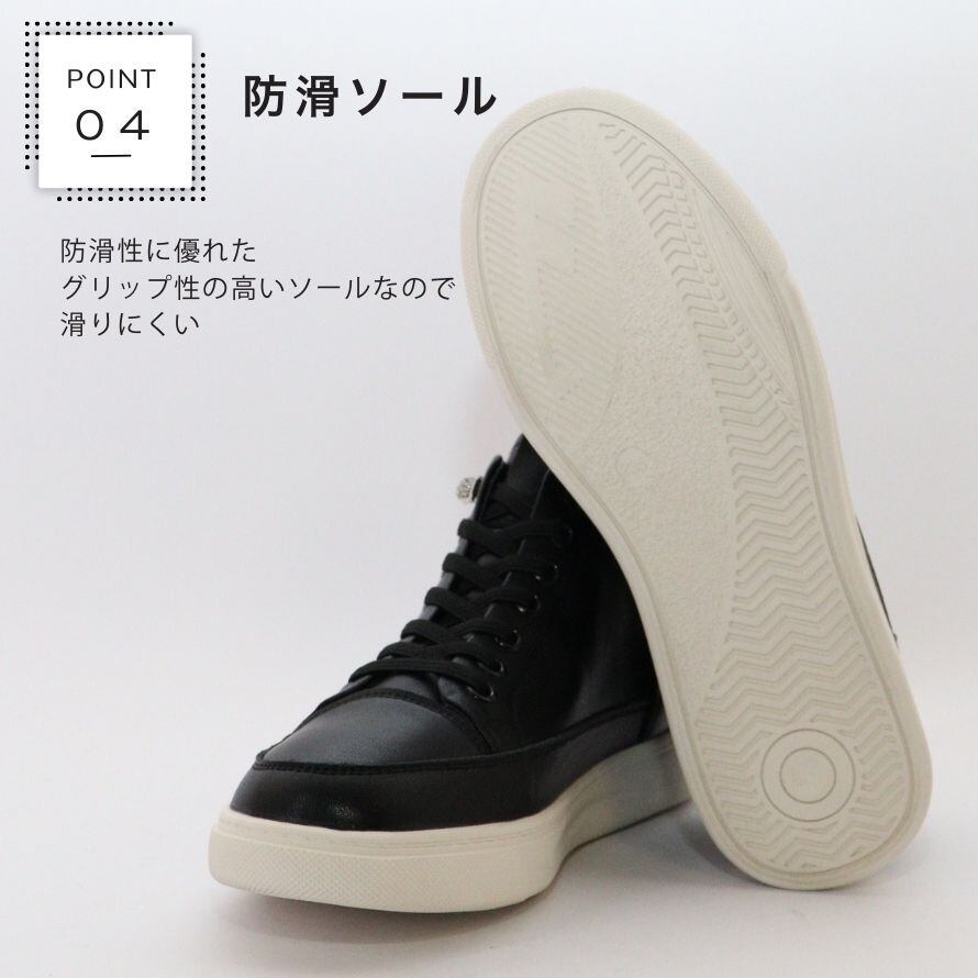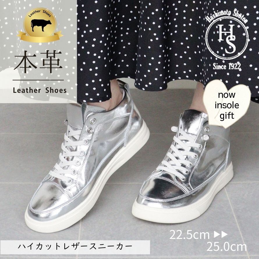 【本革】HS ハイカット 本革 レザースニーカー レディース ハイカットスニーカー 厚底 インソール 軽量 ゴム紐 防滑ソール 歩きやすい きれいめ 大人カジュアル コーデしやすい 黒 白 銀 レザー 高級感 キラキラ金具付き クッション性