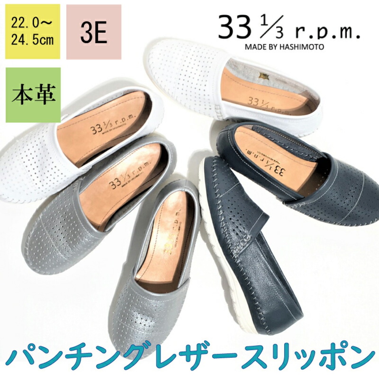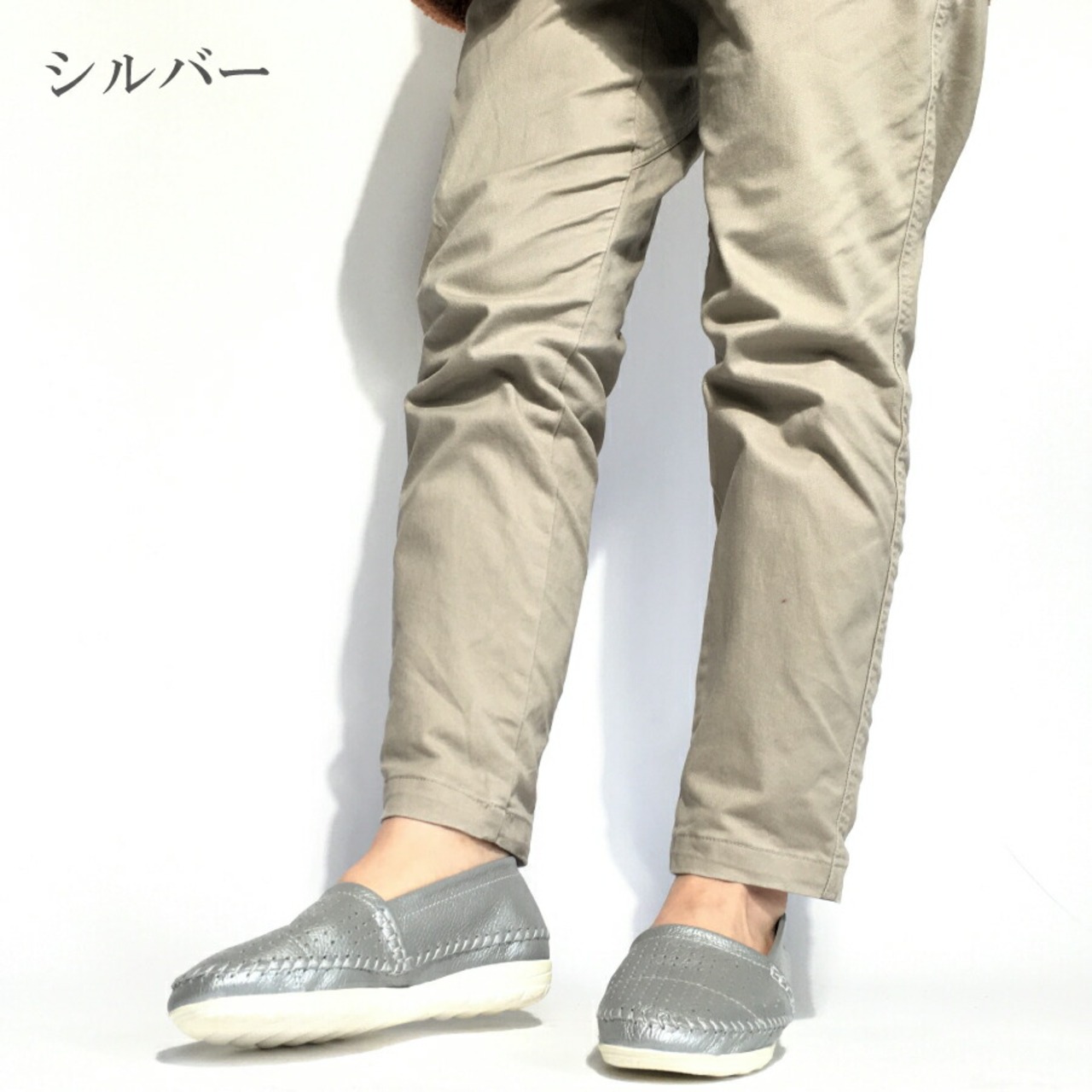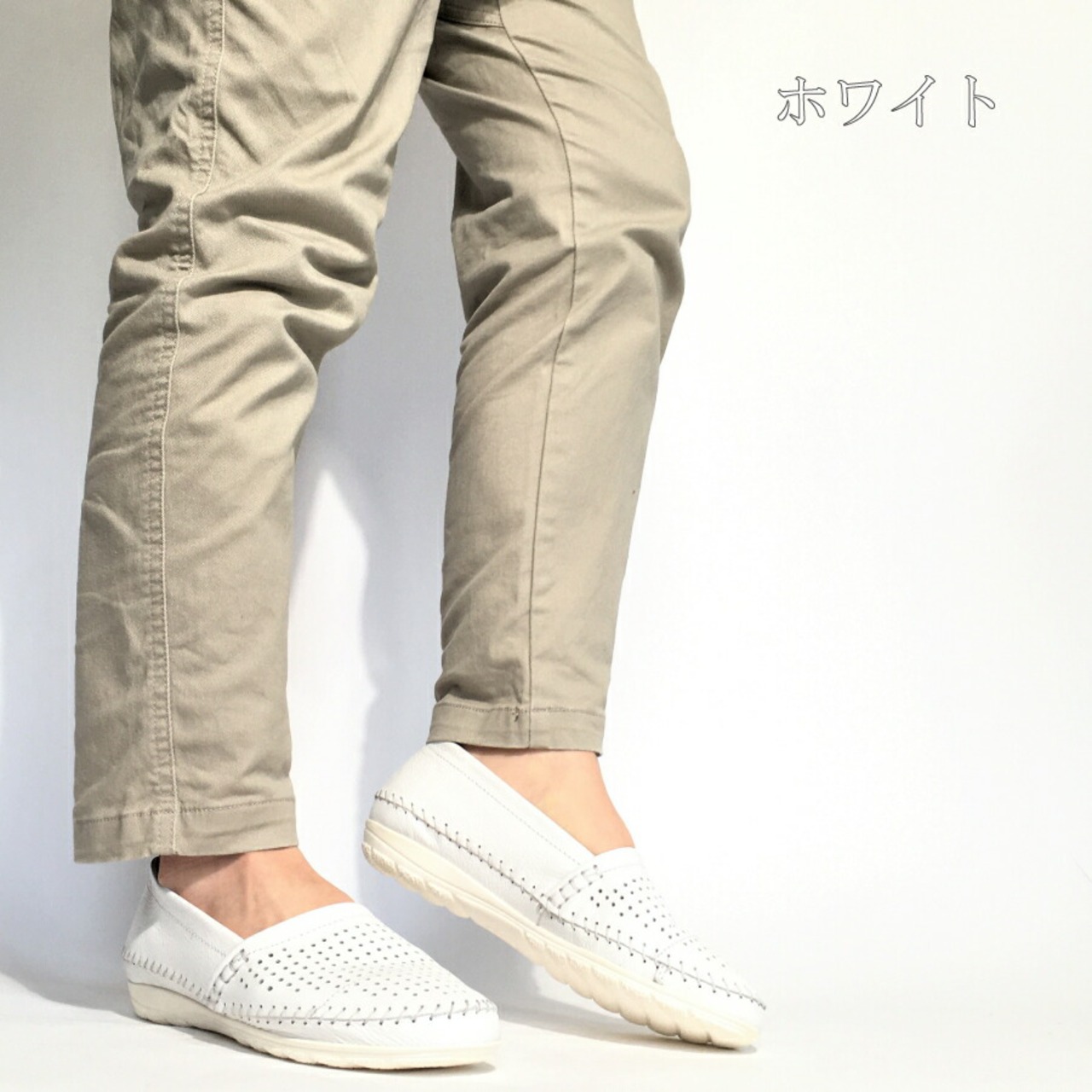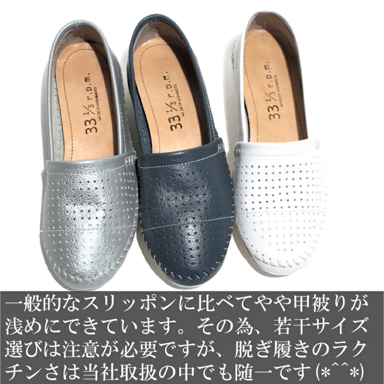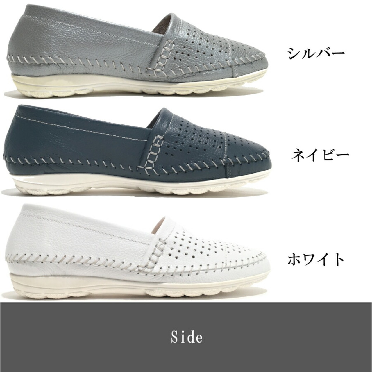 パンチング レザー スリッポン レディース 2cm ローファー ヒール2センチ 3E 外反母趾 ネイビー シルバー ホワイト