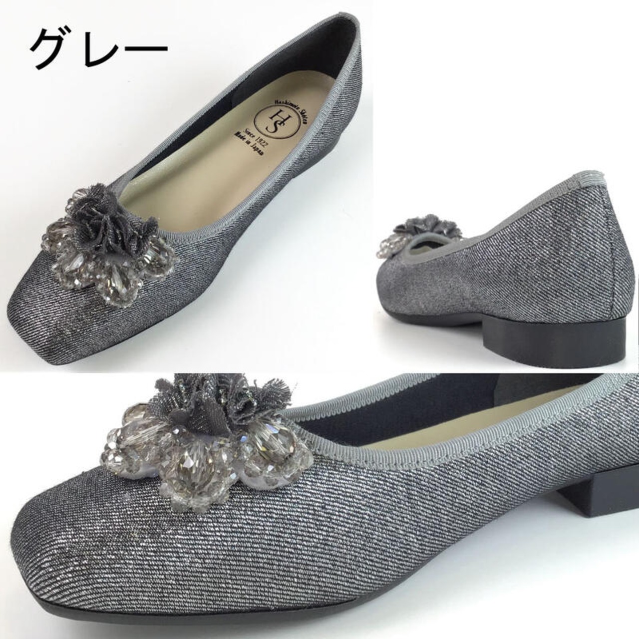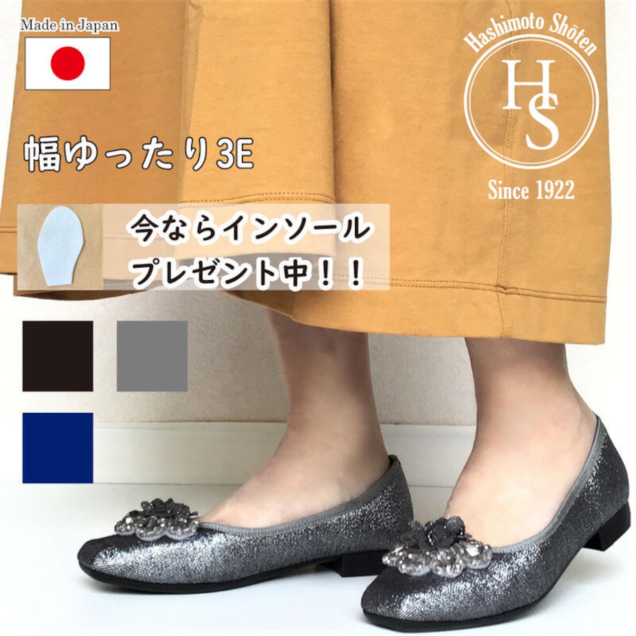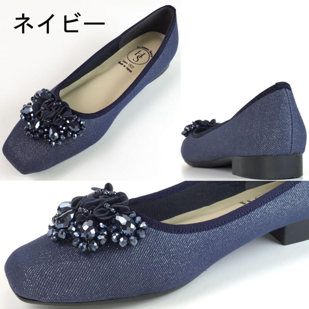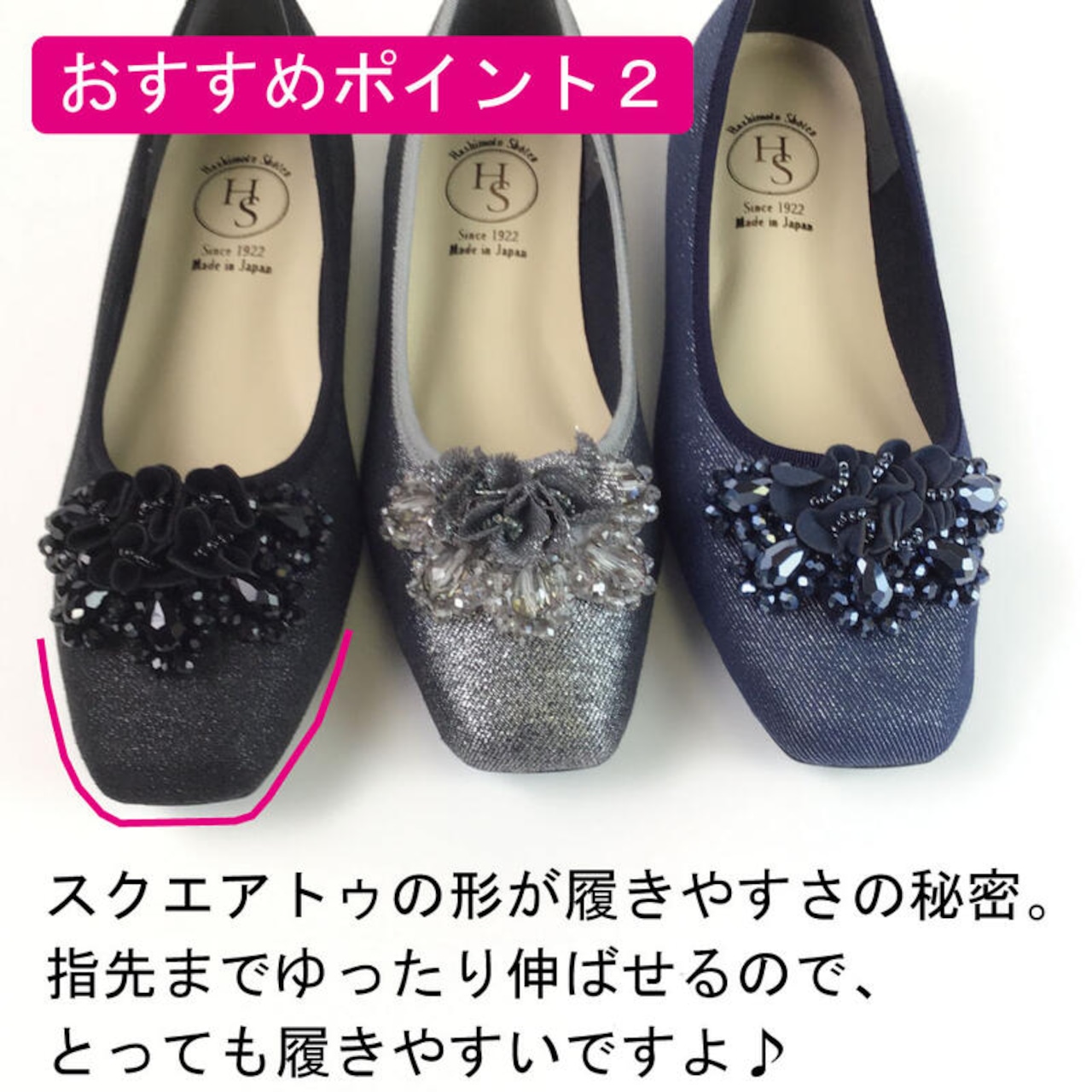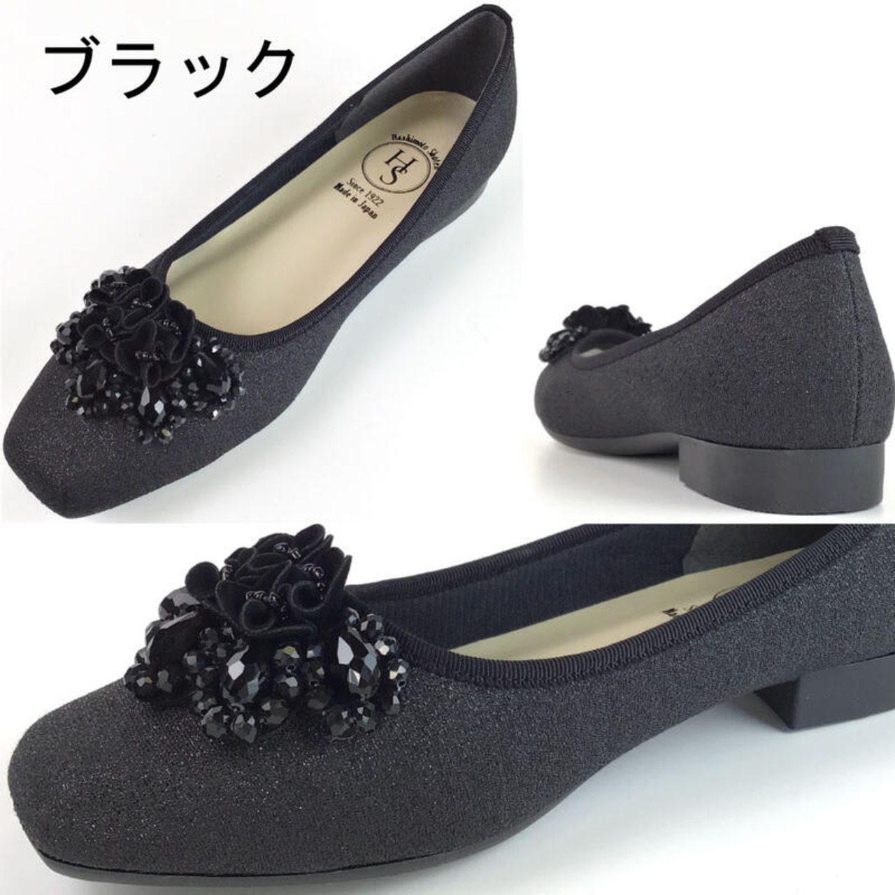 【日本製】 HS スクエアトゥ フラワー パンプス ヒール 3E レディース ビジュー 歩きやすい 黒 半額