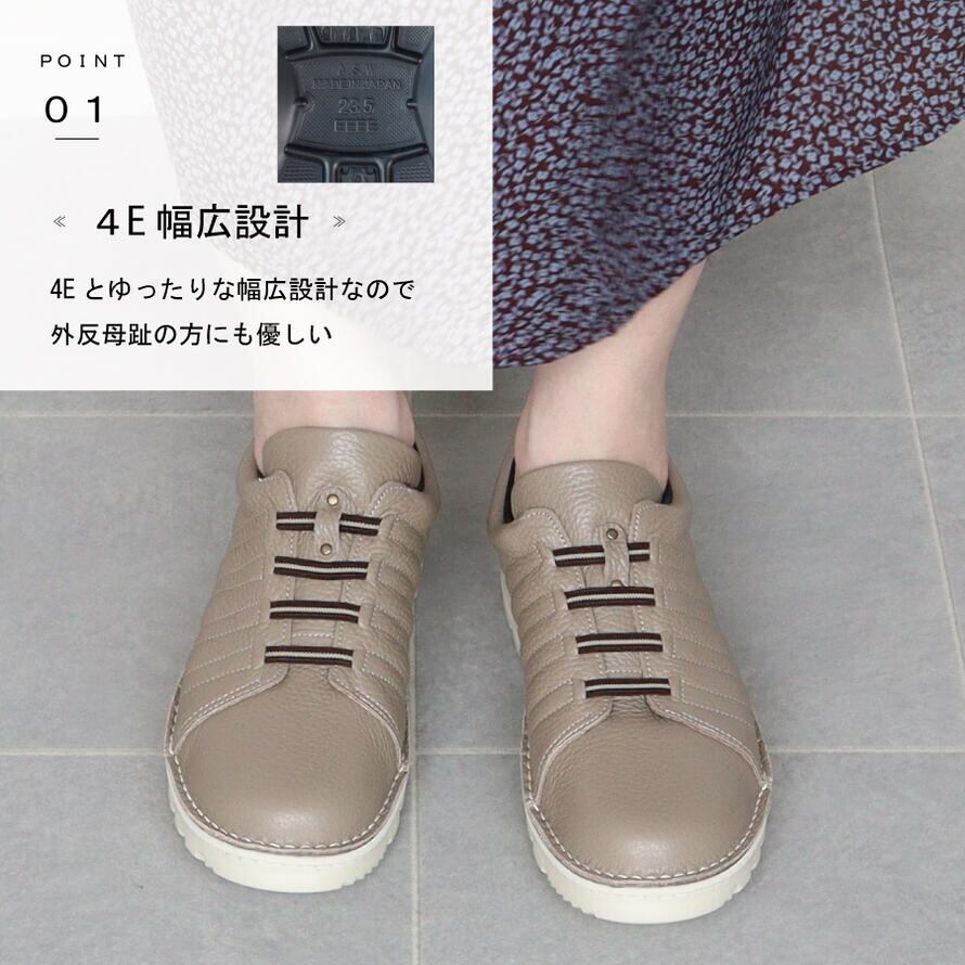 【日本製】 本革 ゴム紐 レースアップ シューズ 4E レザー スニーカー レディース 軽量 甲高 幅広 外反母趾 ヒール 3cm 黒 白 asw dola