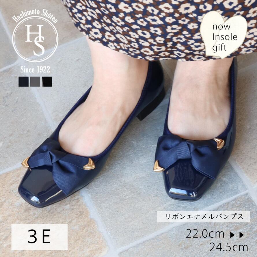 【日本製】 HS 大きめ リボン パンプス ヒール 3E 幅広 ローヒール 黒 痛くない ぺたんこ フラットシューズ エナメル 晴雨兼用