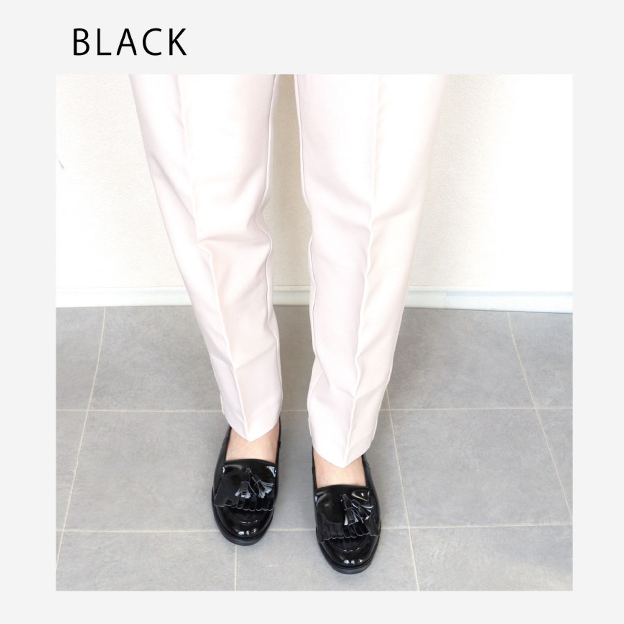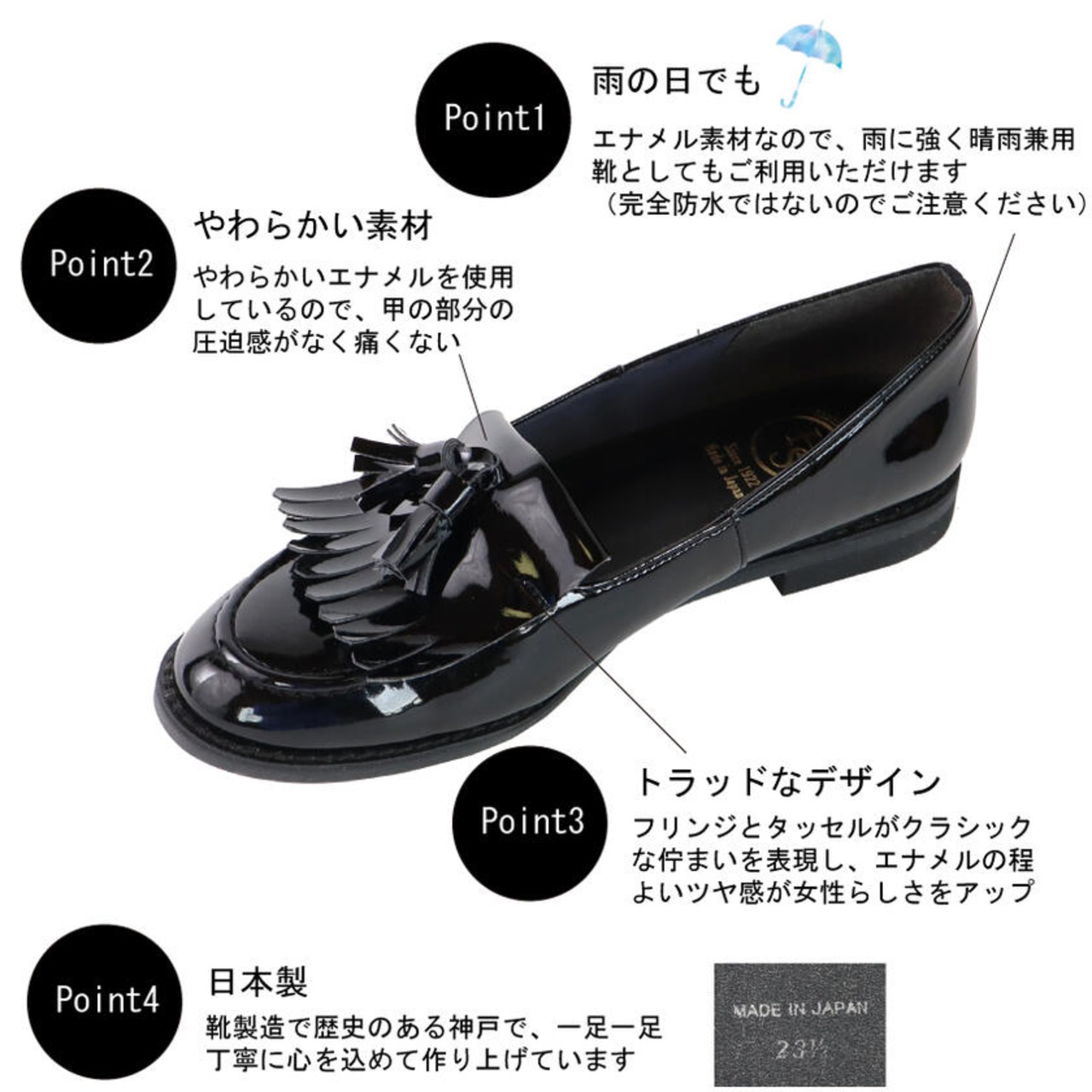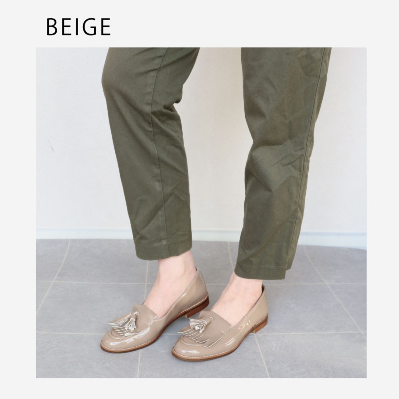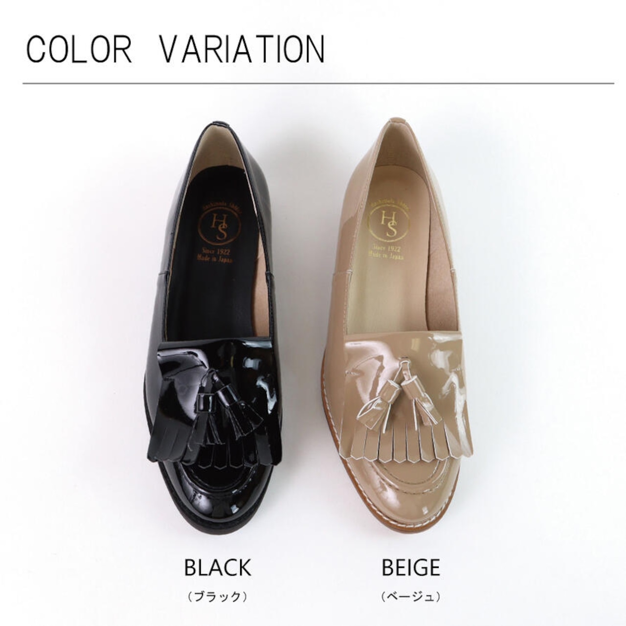 【日本製】 HS エナメル フリンジ ローファー レディース ベージュ ブラック 黒 靴 幅広 キルト トラッド おじ靴 メンズライク