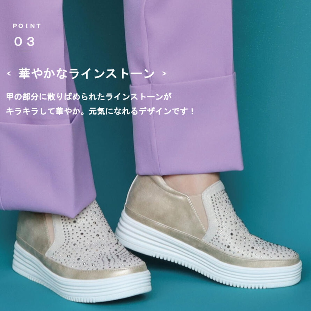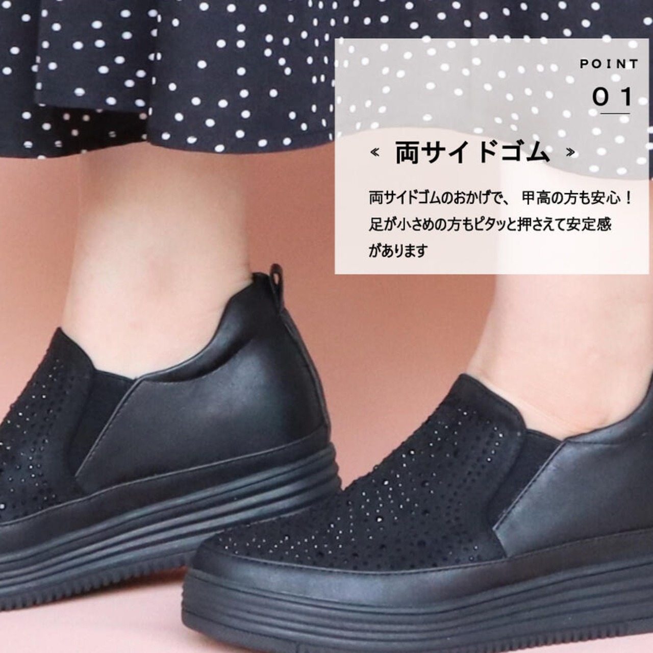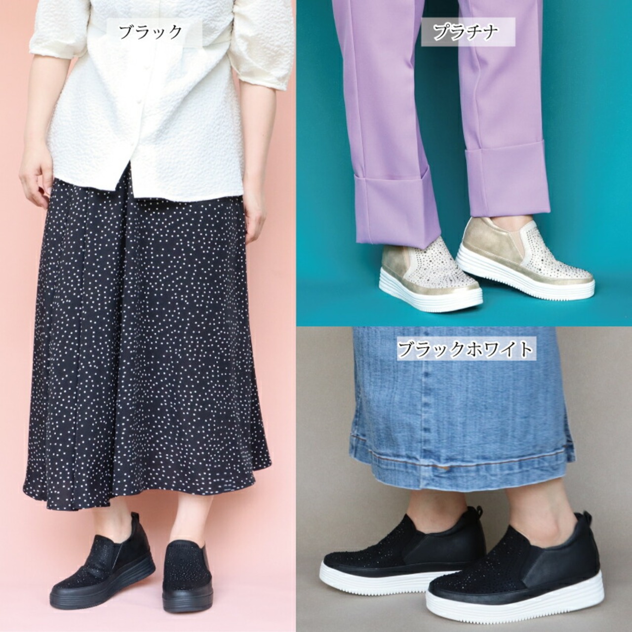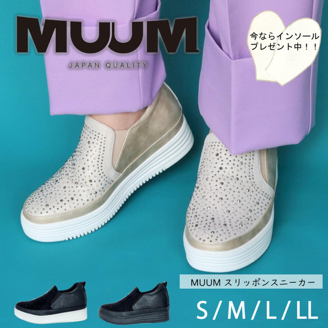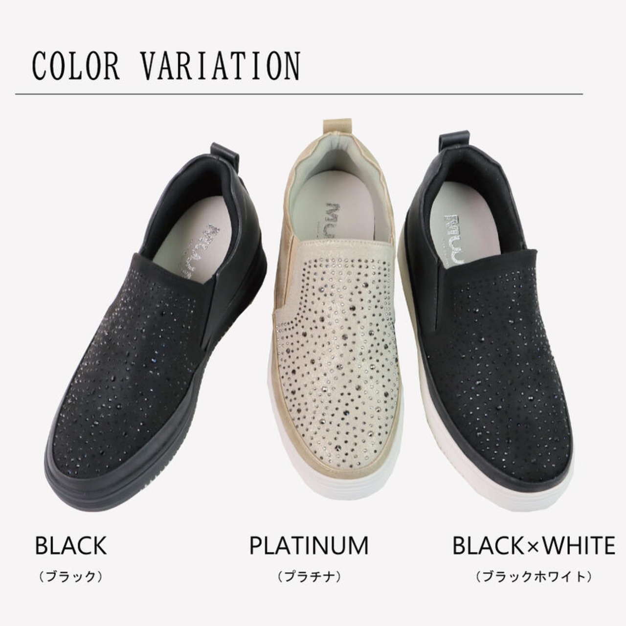 【MUUM】 キラキラ ビジュー 厚底 スリッポン レディース 40代 スニーカー おしゃれ ひもなし 合成皮革 靴 黒 白 ブラック ヒール 3センチ 50代 グリッター ラインストーン