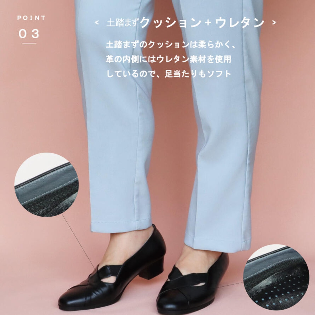 ・インソールのクッションはやわらかく、革の内側にはウレタン素材を使用しているので足当たりソフト
