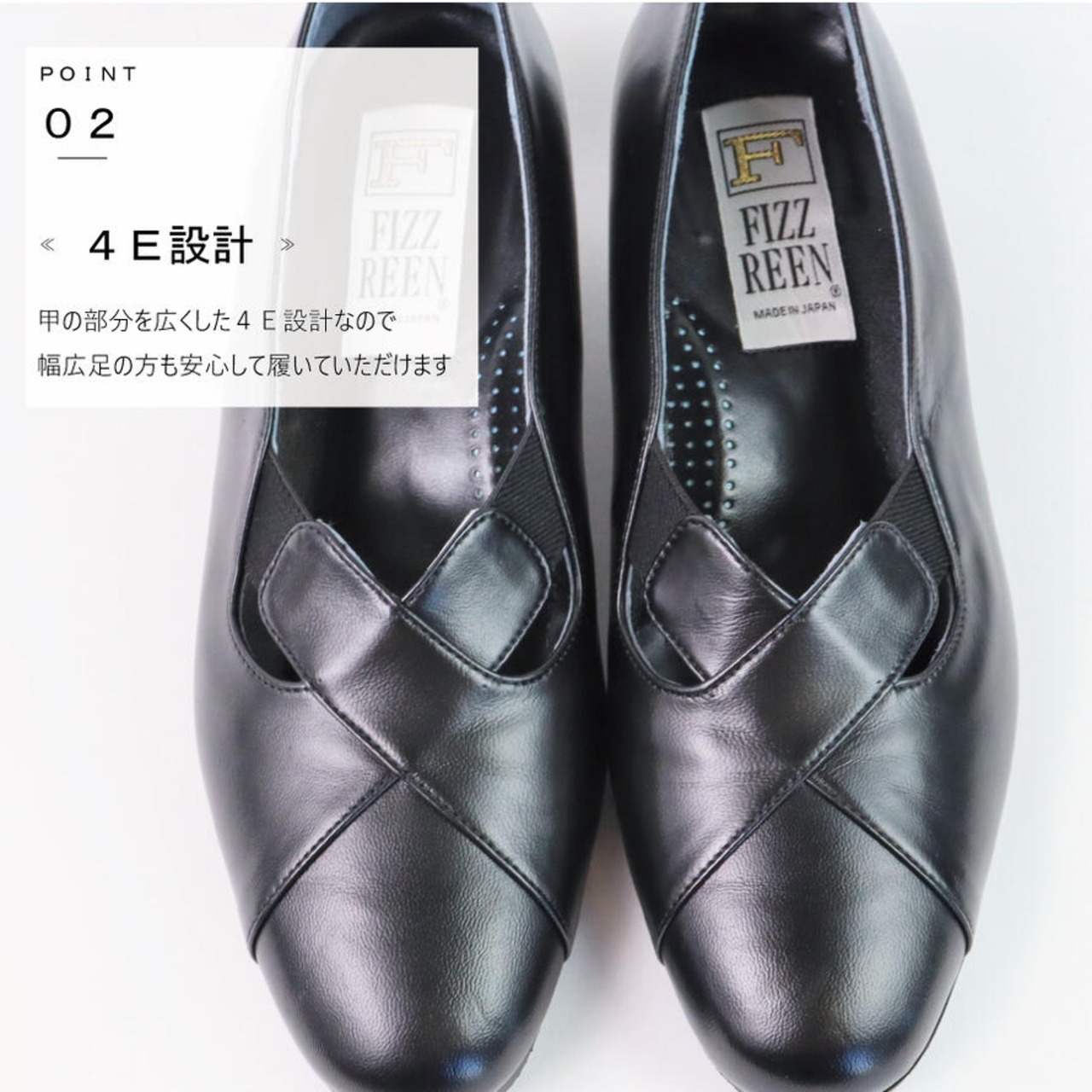【FIZZ REEN】 フォーマル クロス パンプス 4E レザー 疲れない 本革 シンプル おしゃれ 靴 黒 ヒール 4センチ 50代 甲高 幅広 外反母趾 歩きやすい