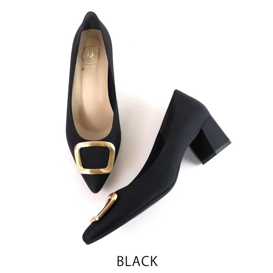 【日本製】 HS バックル サテン パンプス ヒール5センチ ベージュ ブラック チャンキーヒール 歩きやすい 幅広 結婚式 靴