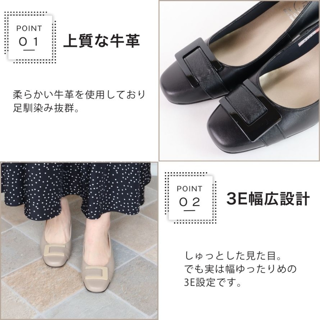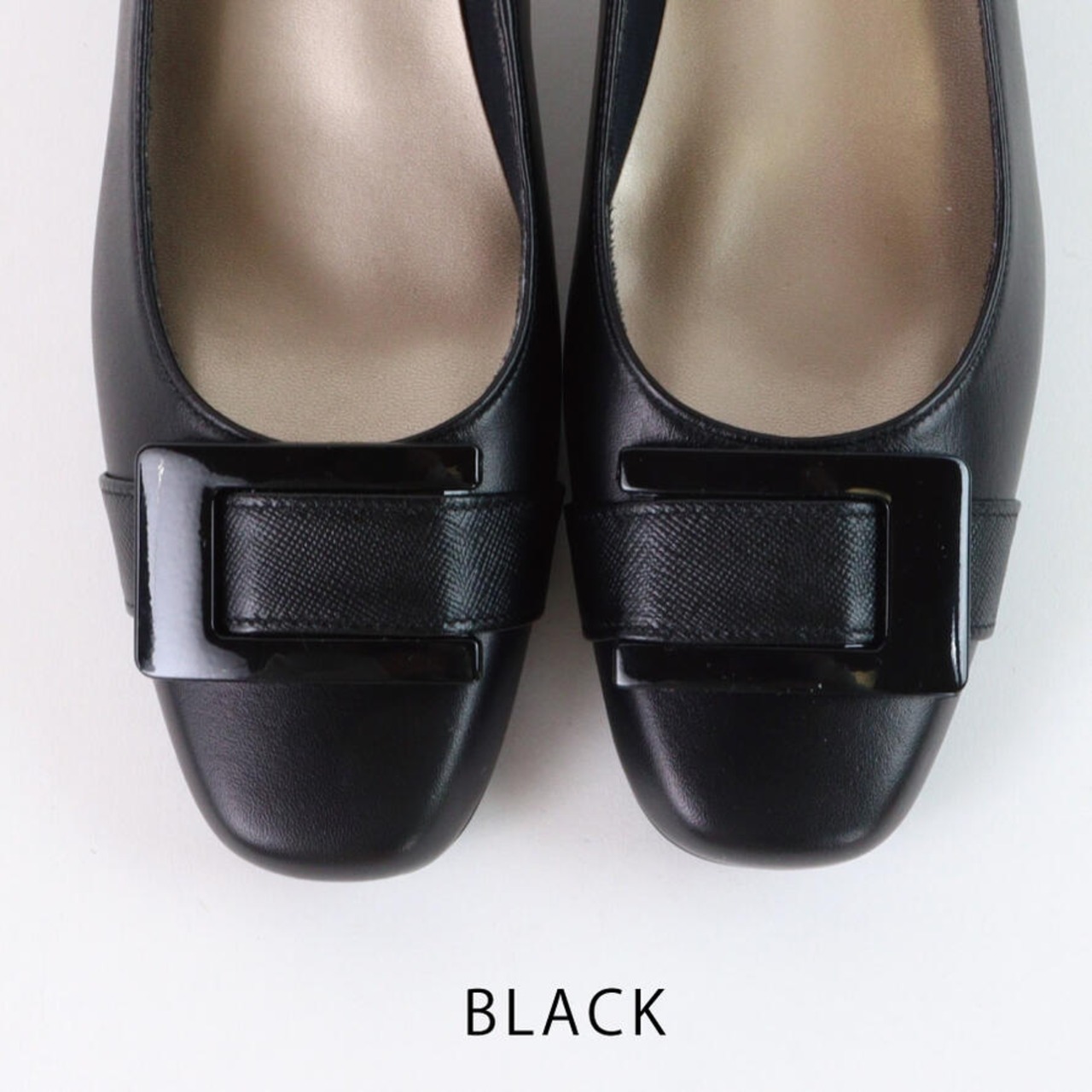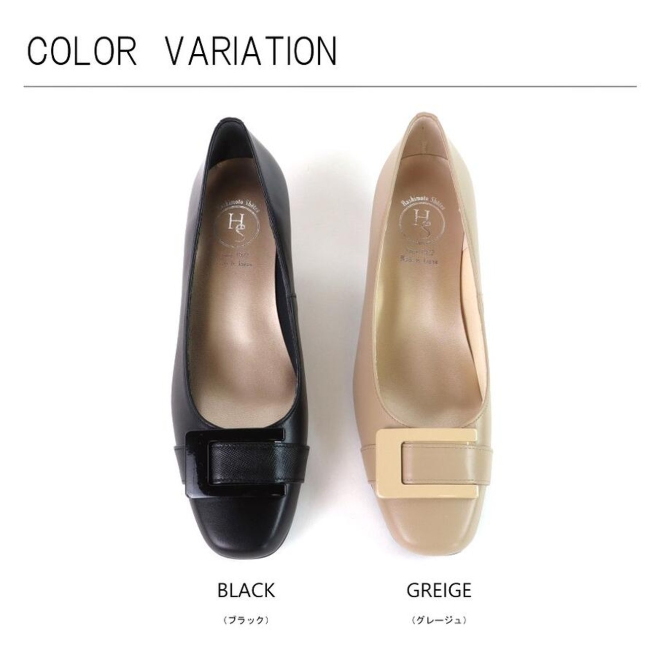 【日本製】 HS バックル レザー パンプス 3E 幅広 甲高 外反敬老趾 黒