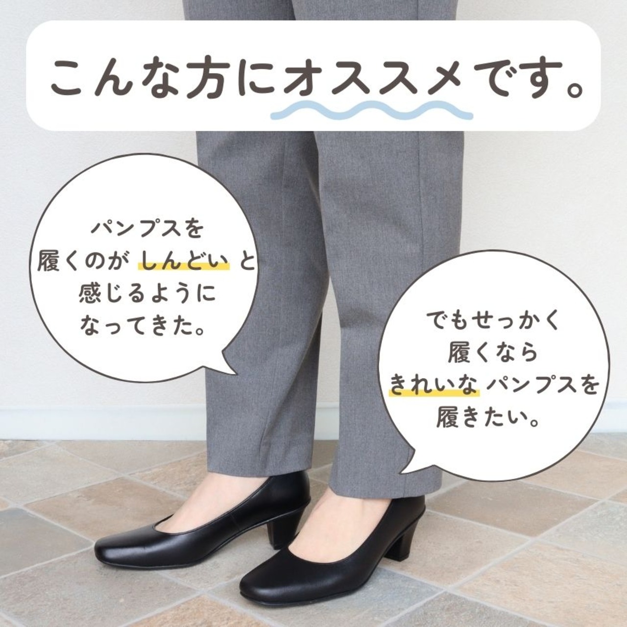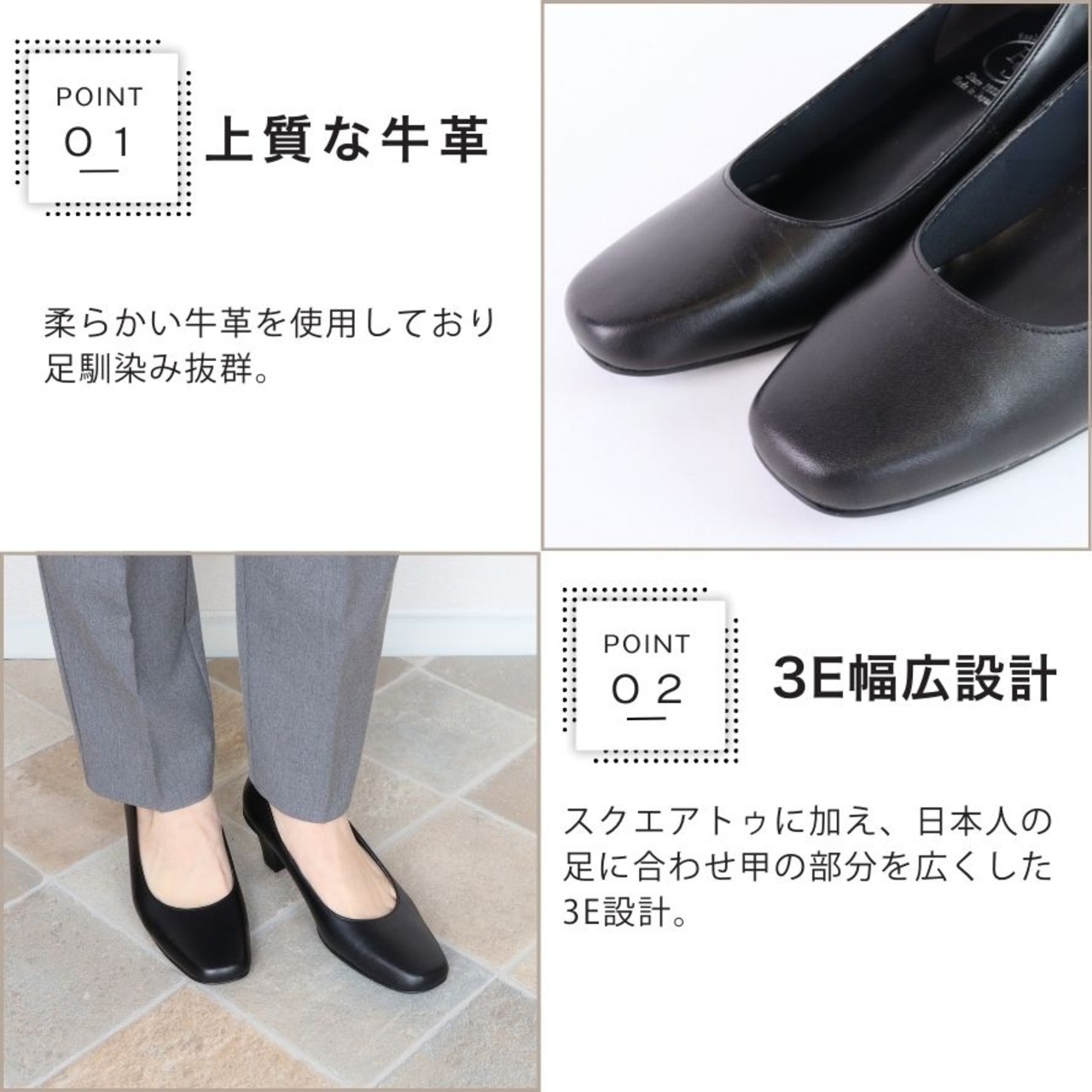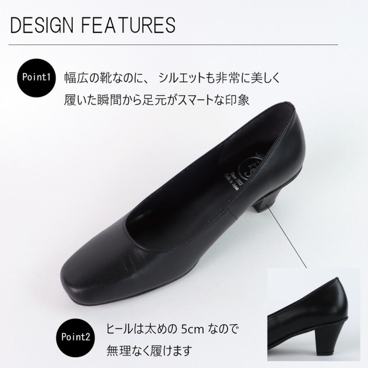 ・スクエアトゥに加え、日本人の女性の足に合わせ甲の部分を広くした3E幅広設計
