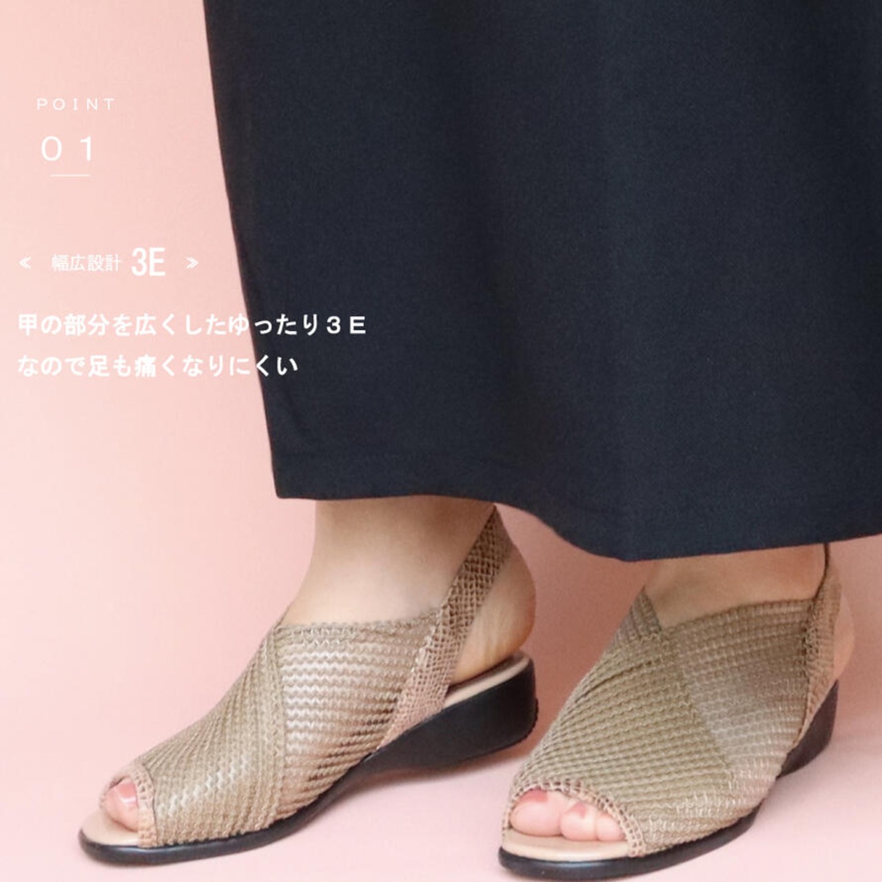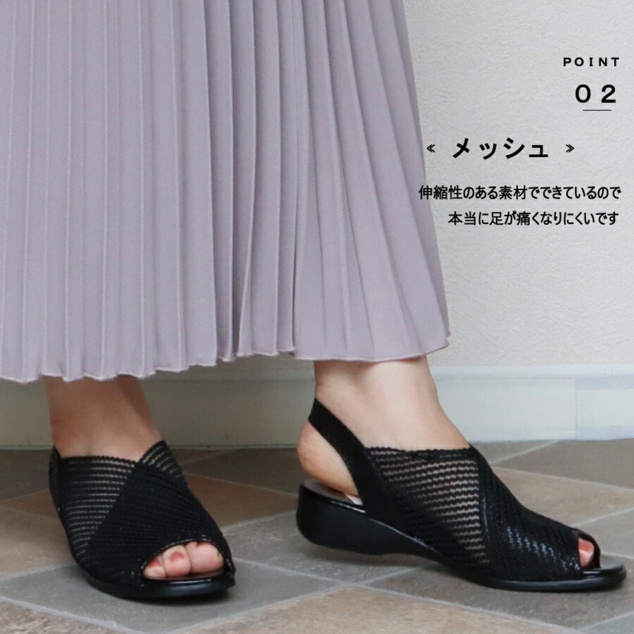 【日本製】 HS バックベルト メッシュ サンダル レディース 3cm ヒール3センチ 3E ブラック ぺたんこ 歩きやすい