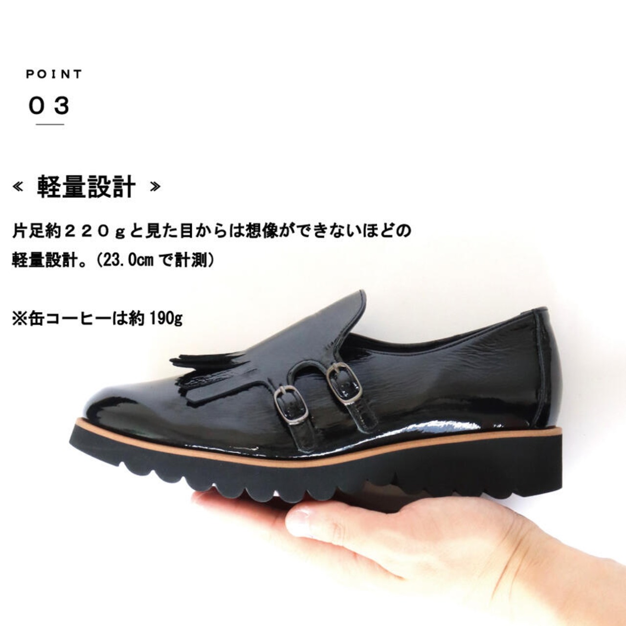 ・23.0cmで片足約220gと見た目からは想像できいないほどの軽量設計。