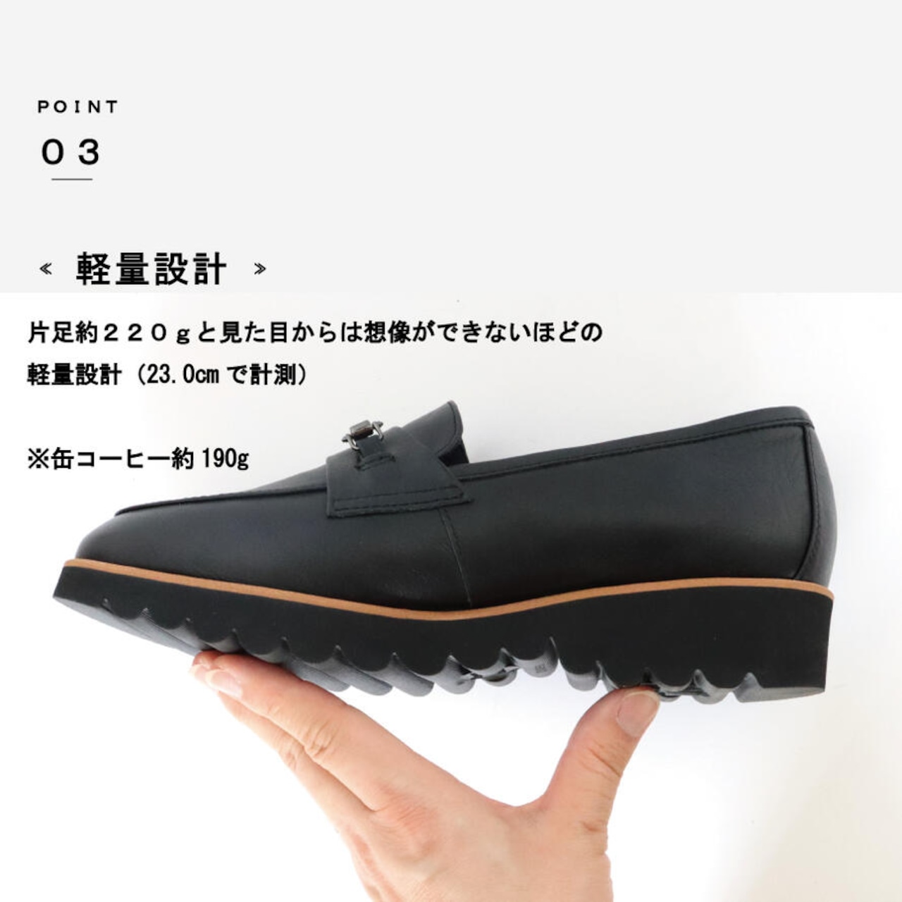 ・片足約220gと軽量なので足の負担が少ない(23.0cmで計測)