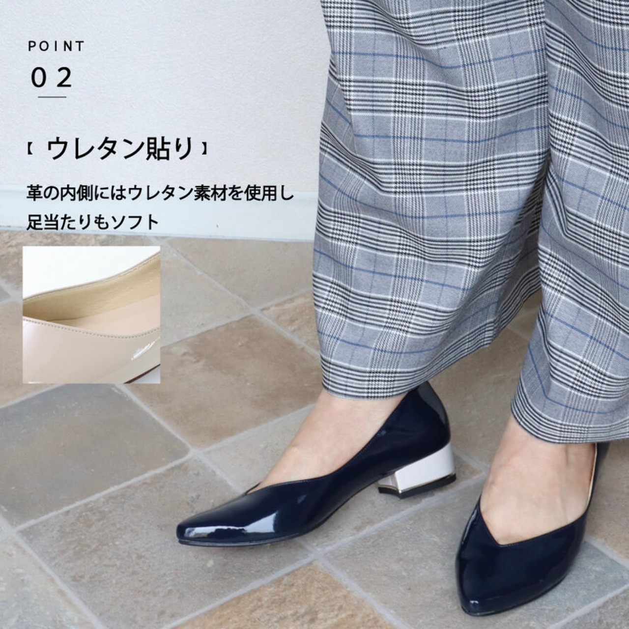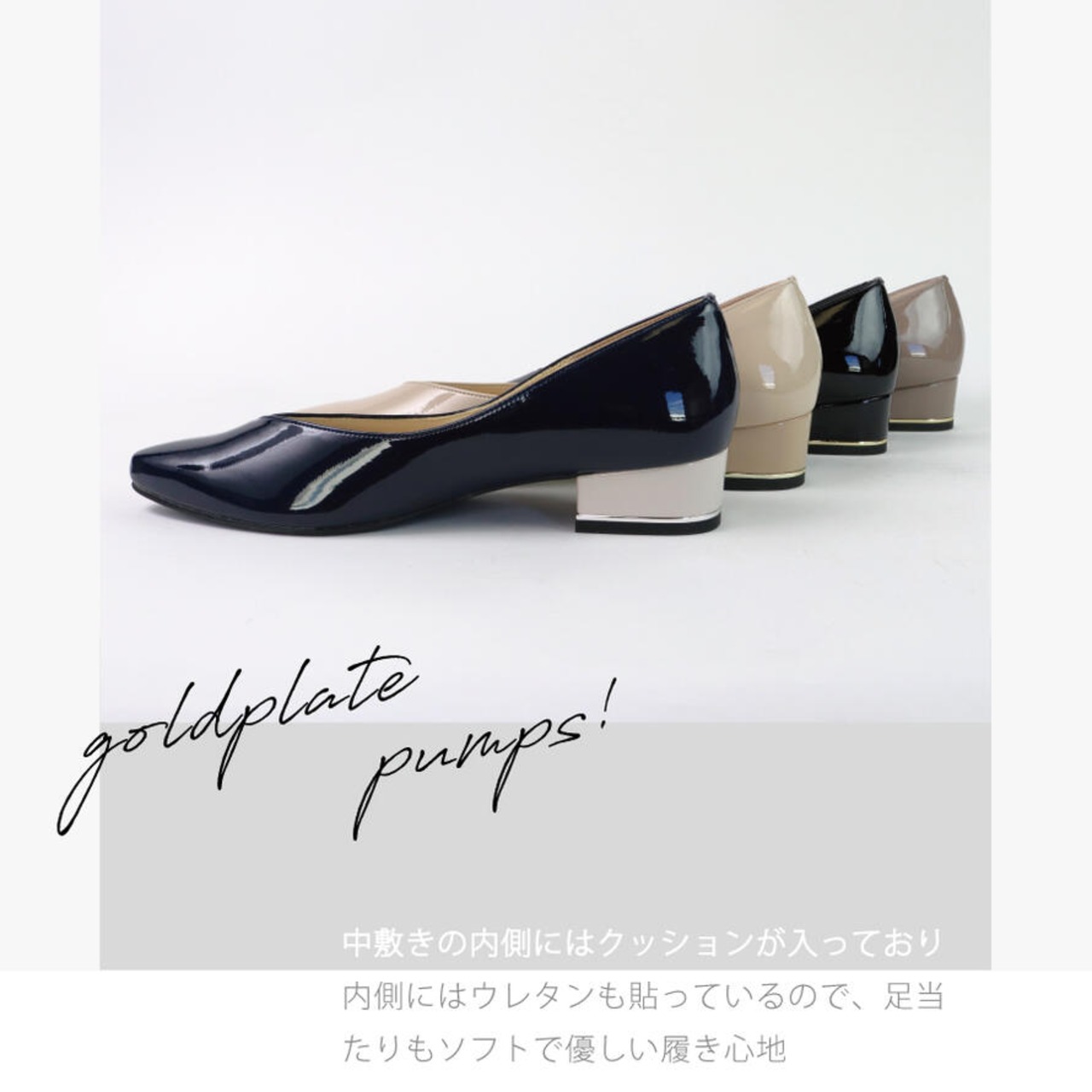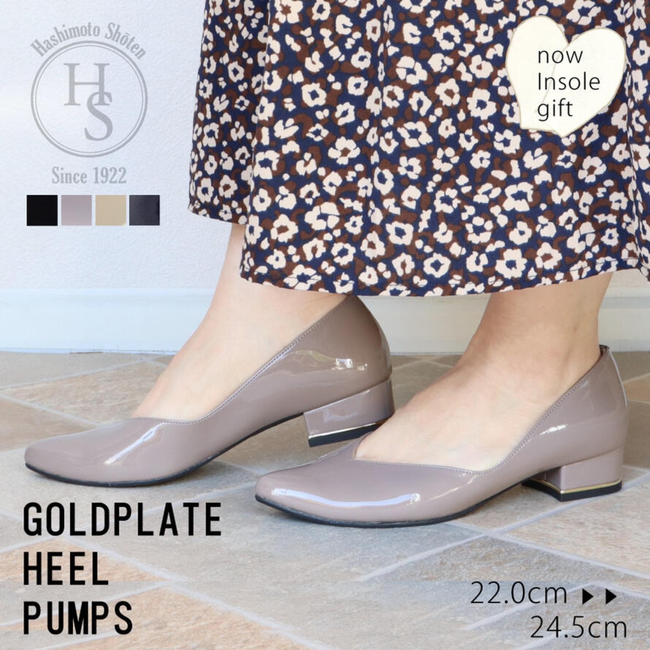 【日本製】 HS ゴールドプレート ヒール パンプス 3cm ヒール3センチ ベージュ ブラック 幅広 ローヒール 黒 エナメル 雨 レイン