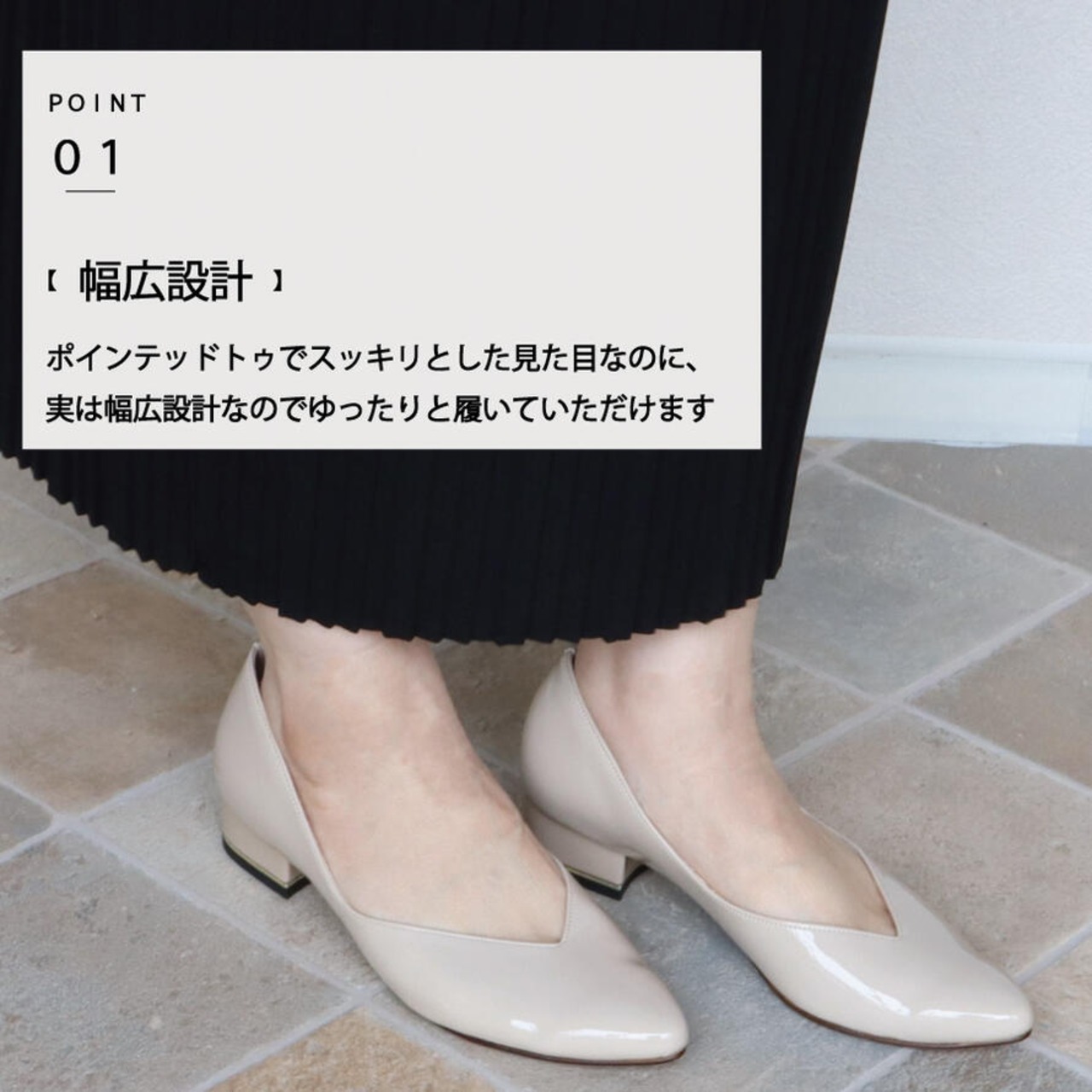 ・ポインテッドトゥですっきりとした見た目なのに幅広設計なのでゆったりと履いていただけます