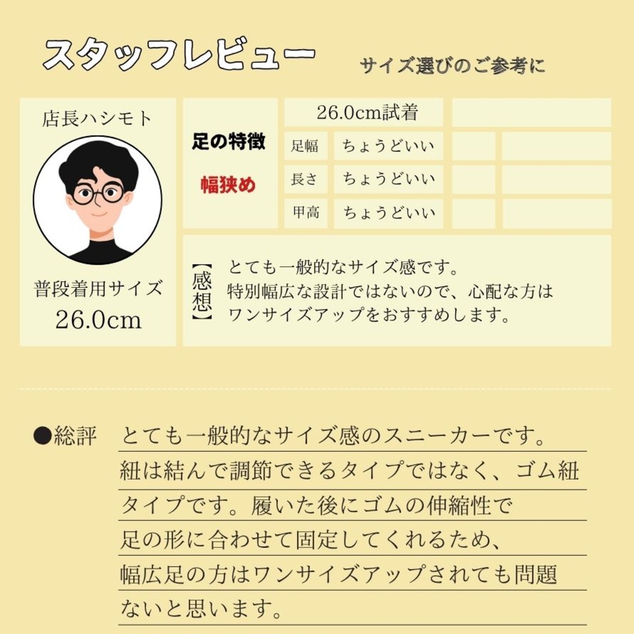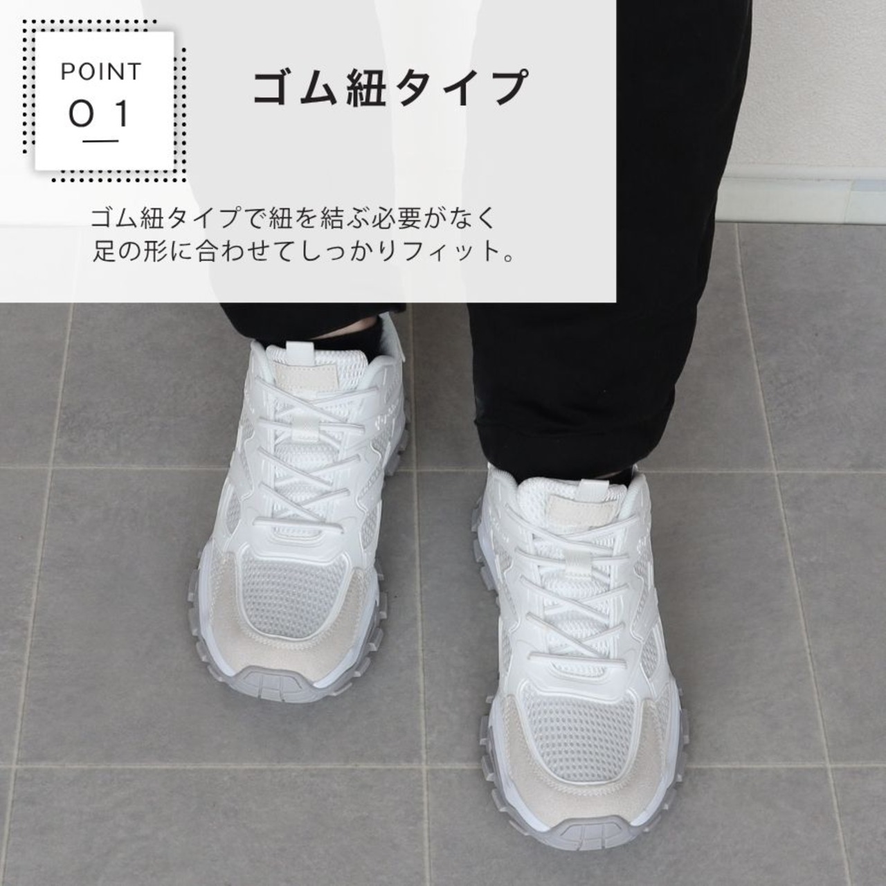 ・ゴム紐タイプなので紐を結ぶ必要はありません。またゴムのおかげで足の形に合わせてぴったりフィット
