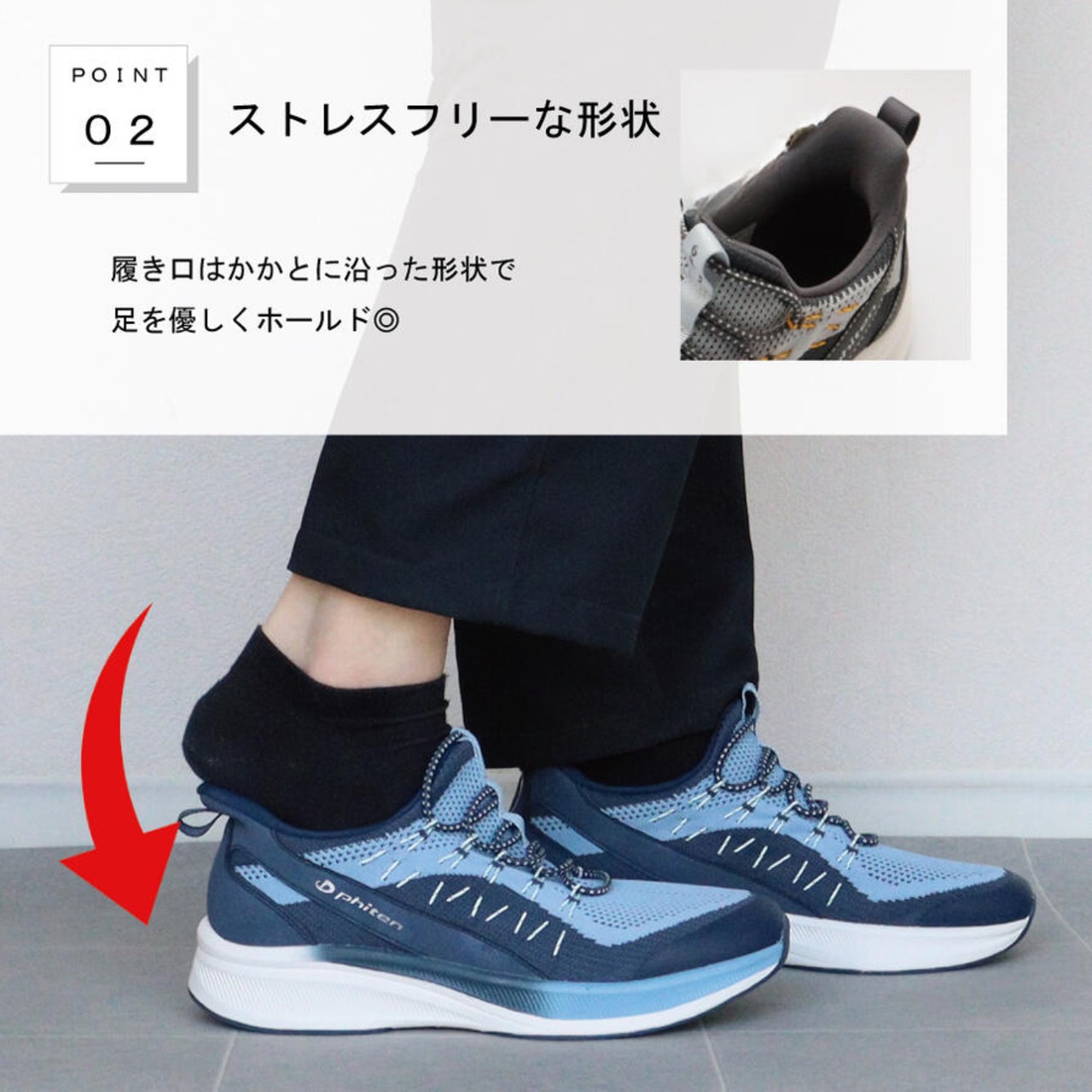 ・履き口はかかとに沿った形状で足を優しくホールド