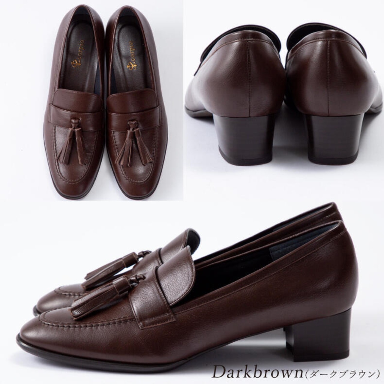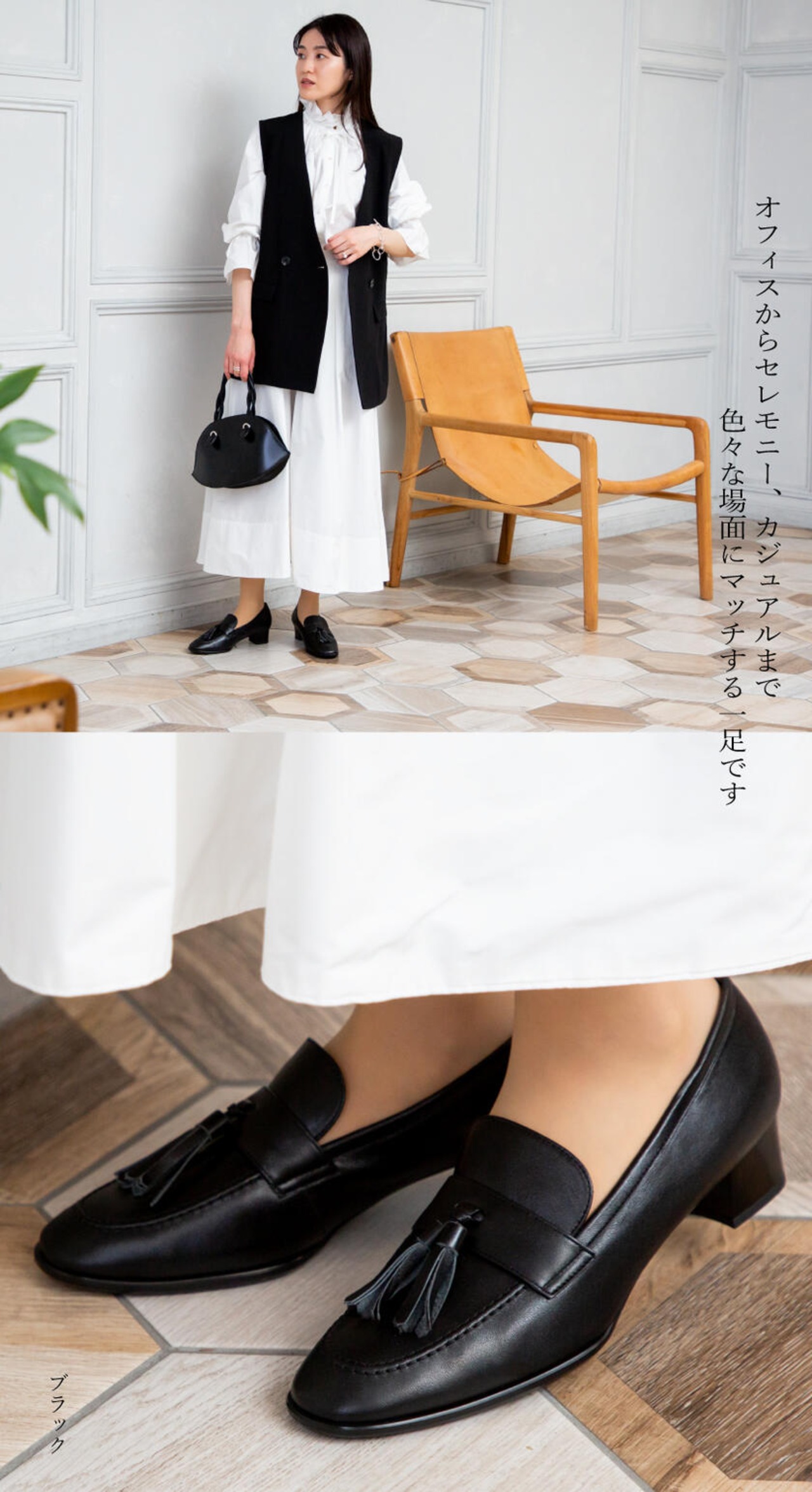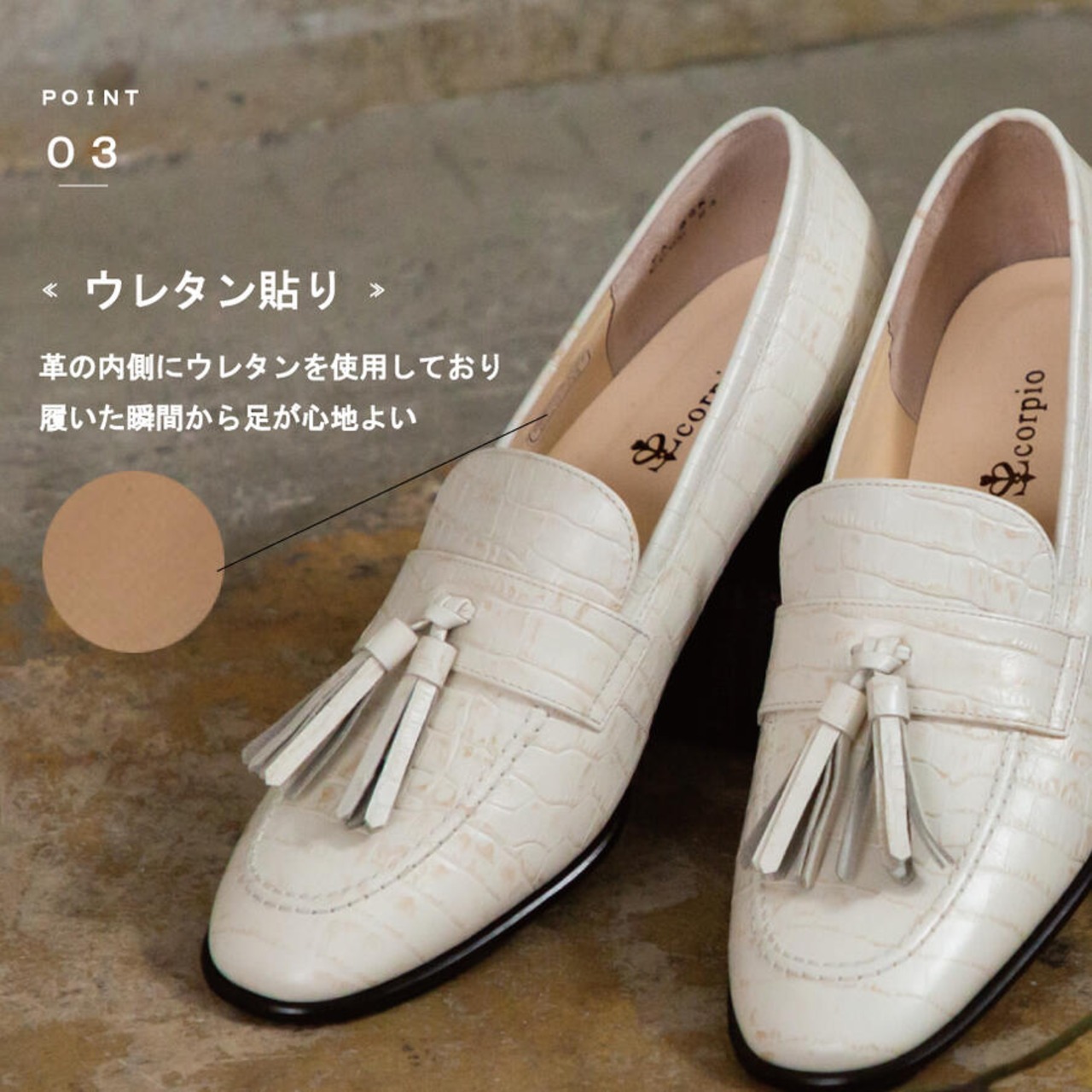 【SCORPIUS】 スコーピウス ヒールアップ タッセル ローファー レディース 日本製 4cm ヒール 本革 大人 おしゃれ 黒 白 パンプス サステナブル