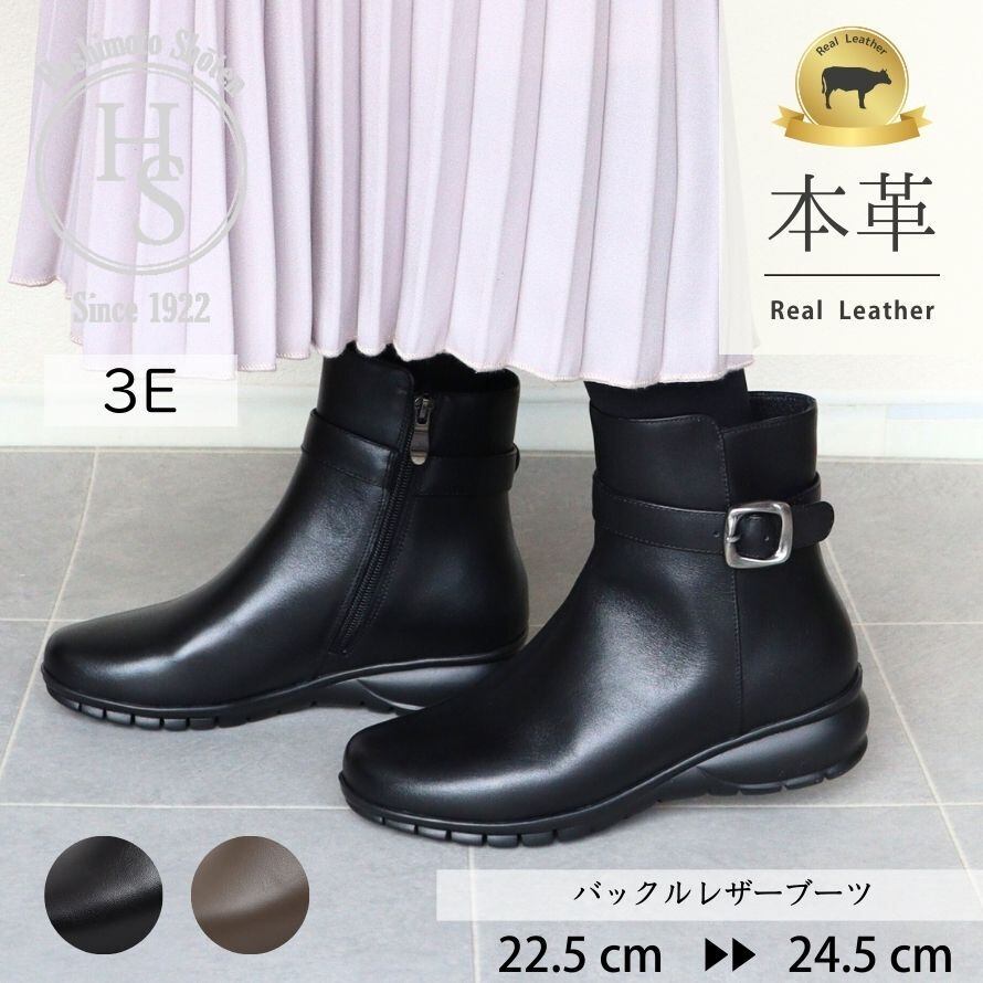 【本革】 バックル レザー ブーツ ショートブーツ レディース 幅広 3E ベルト付き 柔らかい 革靴 歩きやすい 疲れにくい ローヒール 黒 茶 上品 大人 40代 50代 秋冬 きれいめ ブーツ ブラック 35(22.5cm)